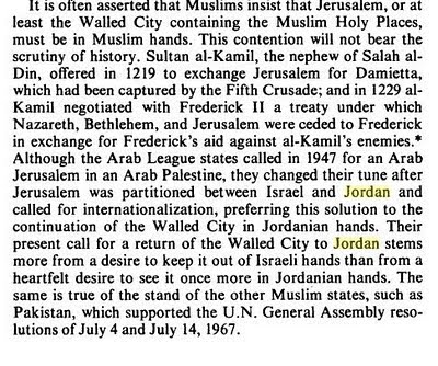 Blog : PhilosémitismeAu 13è siècle les Musulmans étaient prêts à céder Jérusalem"Je présume que les "Palestiniens" du 13ème siècle n'ont pas protesté lorsque la ville qui est supposée être leur capitale éternelle fit l'objet de marchandages, comme ils n'ont pas protesté lorsque Jérusalem était sous contrôle ottoman, britannique et jordanien." Source: Elder of Ziyon (When the Muslims bargained away Jerusalem) Ci-dessous un passage intéressant d'un ouvrage écrit par H. Eugene Bovis intitulé The Jerusalem Question, 1917-1968, publié par la Hoover Institution in 1971. Bovis a passé de nombreuses années dans la région en tant qu'employé du Foreign Service. - En 1219, le Sultan al-Kamil, qui était le neveu de Saladin, a proposé d'échanger Jérusalem contre Damiette qui avait été prise lors de la cinquième croisade. Selon les termes d'un traité qu'al-Kamil négocia en 1229 avec Frédéric II, Nazareth, Bethlehem et Jérusalem seraient cédés en échange de l'aide de Frédéric contre les ennemis d'al-Kamil. - En 1947 la Ligue Arabe voulait une Jérusalem arabe dans une Palestine arabe. Suite à la partition de Jérusalem entre la Jordanie et Israël, la Ligue Arabe changea d'avis et demanda son internationalisation. Commentaire d'Elder: Je présume que les "Palestiniens" du 13ème siècle n'ont pas protesté lorsque la ville qui est supposée être leur capitale éternelle fit l'objet de marchandages, comme ils n'ont pas protesté lorsque Jérusalem était sous contrôle ottoman, britannique et jordanien. On dirait que leur "amour" pour la ville ait des origines plus récentes. 1 commentaire