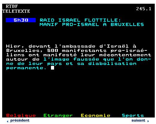 Blog : PhilosémitismeRadio belge: Israël est le pays des Juifs belges ...Les médias francophones belges sont virulemment et obsessionnellement anti-israéliens. Jamais on ne lira, jamais il n'y a un programme un tant soit peu favorable à Israël. Comme le démontre à perfection une récente "perle" de la RTBF (Belgique francophone). Une nouvelle preuve d'impartialité et de professionnalisme journalistique. Capture d'écran d'un télétexte de la RTBF (07/06) ... Celle-ci véhicule une image "faussée" d'Israël mais des Juifs belges eux-même. De nombreux non-Juifs sont également allés manifester leur soutien à Israël, sont-ils des Israéliens également ? "[...] 500 manifestants pro-israéliens ont manifesté leur mécontentement autour de l'image faussée que l'on donne de leur pays [...]" Source: La Belgique francophone, Israël et les Juifs | Membre Juif.org