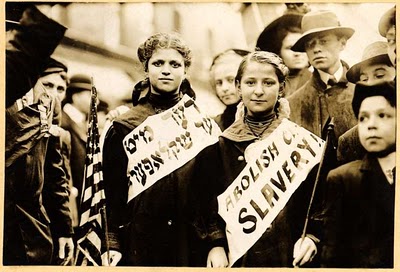 Blog : PhilosémitismeDétournement de photo pour déligitimer IsraëlVersion 1909 et version 2010 (Electronic Intifada) de la même photo. A bout de resources et d'arguments ils ne reculent devant rien pour légitimer leur haine d'Israël. De vrais incapables - il ne leur reste à ces héros minables - que de s'identifier pitoyablement à de vraies et nobles syndicalistes de 1909. New York, 1er mai 1909: Manifestation syndicale contre le travail des enfants dans le secteur de l'industrie textile américaine qui employait, à l'époque, une majorité de femmes récemment arrivées d'Europe de l'est. Les deux jeunes filles portent des rubans demandant l'abolition de l'"esclavage infantil" en anglais et en yiddish. (New York, 1er mai 1909, manif contre le travail des enfants, photo du Library of Congress, George Grantham Bain Collection) | Membre Juif.org