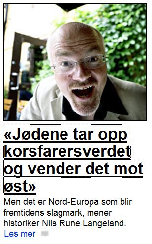 Blog : PhilosémitismeHistorien norvégien: les Juifs sont les nouveaux croisésIl est clair que beaucoup d'Européens partagent le point de vue de l'historien norvégien même s'ils ne s'expriment pas aussi brutalement que lui sur Israël et les Juifs. Ils croient dur comme fer à leurs lobbies, à leur irrationalité, à leur matérialisme, à leur goût pour la guerre (qu'ils font faire aux autres bien entendu), à leur cruauté, à leur roublardise etc). C'est pour ça que la journaliste a passé à la question suivante sans questionner le Professeur Langeland sur ses assertions à propos des Juifs et d'Israël. "Les vrais héritiers des croisés européens sont les USA et les Israël" Source: Norvège, Israël et les Juifs (Dagbladet: ?Jews pick up crusader-sword and point it eastwards') Le quotidien norvégien Dagbladet a publié hier un un entretien avec l'historien norvégien Nils Langeland Rune. Celui-ci affirme que les USA et "les Juifs" sont les nouveaux croisés en raison de leur "l'agitation démoniaque". L'interview est parue en première page et est intitulée "Les Juifs ont ramassé l'épée des croisés et la pointent vers l'Orient". La journaliste Inger Merete Hobbelstad l'interrogeait sur le livre qu'il vient de publier sur l'Europe. Mr. Langeland, qui enseigne à l'Université de Stavanger, évoque l'héritage martial de l'Europe et comment il s'est manifesté envers l'islam. Il parle des croisades, de la décadence contemporaine et s'interroge sur la viabilité du multiculturalisme tel qu'il est pratiqué dans les sociétés modernes. Il suggère que l'Europe du Nord pourrait devenir un champ de bataille et que les USA et "les Juifs" mus par leur "agitation démoniaque" sont les croisés des temps modernes. Traduction: Nils Rune Langeland: Non, les vrais héritiers des croisés sont les USA et Israël. Inger Merete Hobbelstad: Comment ça' Nils Rune Langeland: On trouve chez eux l'agitation démoniaque qui animait les Européens dans le passé. L'Europe s'est déchristianisée dans les années quarante, à l'époque où Mgr von Galen condamnait les nazis, et a pris une voie différente. Ce sont les Juifs qui ont ramassé l'épée du croisé et la pointent vers l'Orient. Chose intéressante, la journaliste ne réagit pas à cette déclaration et passe à la question suivante qui a trait à l'utilisation du symbolisme chrétien par l'auteur. 7 commentaires