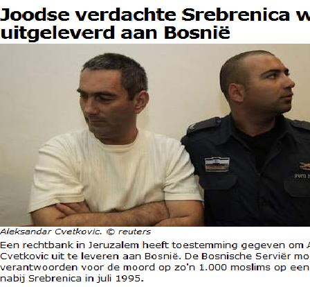 Blog : PhilosémitismeJournaux flamands retirent un article prétendant qu'un Juif aurait participé au massacre de SrebrenicaDeux journaux flamands ont été les seuls au monde à avoir accusé un non-Juif (en fait un Serbe) d'être juif et d'avoir participé au génocide de civils musulmans bosniaques. Si un moment l'information se trouvait également sur le site Web de trois journaux hollandais, elle fut vite retirée et leur titre était nettement moins brutal: "Israël extrade un Juif suspecté [d'avoir participé au massacre de] Srebenica vers la Bosnie" que celui de leurs homologues flamands qui titraient "Un Juif suspecté [d'avoir participé au massacre de] Srebenica est extradé vers la Bosnie". Plutôt que ce rectifier l'information, comme l'ont fait leurs homologues hollandais, ils ont tout simplement supprimé la page... Pour s'en rendre compte il suffit de cliquer sur ces liens De Morgen et Het Laatste Nieuws. Nous reproduisons ci-dessous notre message d'hier: Un non-Juif ayant participé au massacre de Srebenica qualifié de Juif par deux journaux belges Contexte: Israël va extrader un non-juif ayant participé au massacre de Srebrenica (JSS, 18/01/2011) Deux journaux flamands rapportant l'extradition d'Israël du Serbe Aleksandar Cvetkovi' soupçonné d'avoir participé au massacre de Srebrenica en 1995, en Bosnie orientale, affirment et mettent bien en évidence son origine juive ("Joodse") - ce qui est faux. Un lecteur nous prévient que, leur ayant signalé l'erreur, les quotidiens De Morgen et Het Laatste Nieuws n'ont pas rectifié le titre de leurs articles, comme le démontrent ces deux captures d'écran réalisées ce matin. Avec des exemples comme celui-ci, on ne s'étonnera pas qu'on fait de moins en moins confiance aux médias traditionnels. Notre lecteur nous indique qu'aux Pays-Bas, la même erreur s'était produite, mais fut corrigée immédiatement: "Moins d'une heure après mon appel à l'ANP (l'AFP hollandaise) et à l'AD (Algemeen Dagblad, un quotidien du groupe Van Thillo) les trois sites hollandais AD, Parool et Trouw avaient changé le texte et enlevé mot "juif" du titre "Israël extrade un Juif soupçonné d'avoir participé au massacre de Srebenica en Bosnie". En revanche ce ne fut pas le cas en Belgique: or l'agence de presse ANP prétend ne pas être l'auteur du titre... laissant supposer que ce sont ces deux quotidiens flamands qui l'ont rédigé. Parool et AD appartiennent pourtant au même groupe De Persgroup que HLN et De Morgen! Voici les liens vers les quotidiens hollandais ("juif" figure encore dans les liens): http://www.ad.nl/ad/nl/1013/Buitenland/article/detail/2824941/2011/08/01/Israel-levert-joodse-verdachte-Srebrenica-uit-aan-Bosnie.dhtml http://m.trouw.nl/article/4324/2824941/Israel-levert-joodse-verdachte-Srebrenica-uit-aan-Bosnie.html http://www.parool.nl/parool/nl/225/BUITENLAND/article/detail/2824941/2011/08/01/Israel-levert-joodse-verdachte-Srebrenica-uit-aan-Bosnie.dhtmlAucun autre média au monde n'a fait mention qu'il est juif, parce qu'il ne l'est pas!L'AFP et Le Monde donnent l'information correcte. Reuters également. | Membre Juif.org