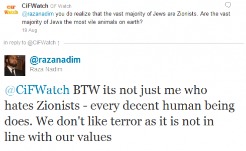 Blog : PhilosémitismeRaza Nadim: "Les sionistes sont les animaux les plus abjects sur terre"On a tort de ne pas s'alarmer et de ne pas prendre au sérieux les dirigeants musulmans européens qui tiennent publiquement ce genre de propos: diabolisation et animalisation des Juifs=sionistes. Comme l'écrit Adam Levick: "Ces propos vont au-delà de la simple haine. C'est de l'incitation à la haine dans son expression la plus pure. Si vous êtes l'animal le plus abject sur terre, votre meurtre n'est pas seulement acceptable. Il est souhaitable." Raza Nadim, porte-parole du Muslim Public Affairs Committee UK: "Le MPACUK s'oppose à l'idéologie politique raciste du sionisme et a pour vocation de contrer l'influence du lobby sioniste. Il y a des preuves concrètes qui démontrent que l'agenda sioniste consiste à dominer le Moyen-Orient et à fomenter un "clash des civilisations" entre l'islam et "l'Occident". Par conséquent, nous croyons que l'anti-sionisme est une priorité stratégique pour faire échec à la plus grande et urgente menace à laquelle l'Oumma est confrontée." Traduction: "A propos, ce n'est pas seulement moi qui déteste les sionistes - c'est le cas de tout être humain habité par un minimum de décence. Nous n'aimons [!] pas la terreur car elle ne fait pas partie de nos [!] valeurs [!]." Le bonhomme accuse aussi la Belgique et l'Europe d'islamophobie. Source: CIF Watch (Muslim Public Affairs Committee UK spokesman: ?Zionists are most vile animals to walk the earth') 3 commentaires