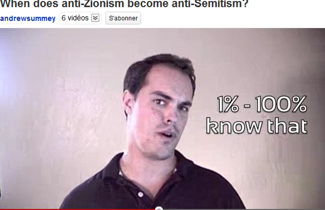 Blog : PhilosémitismeConstat: les Juifs sont de plus en plus puissantsAndrew Summey analyse dans cette vidéo la rhétorique d'une bande de zozos anti sionistes/antisémites qui a manifesté contre le "régime sioniste" à Toronto. Un savant s'en prend à Barack Obama: "Cet homme noir dans la Maison Blanche" qui ne peut rien refuser à l'"Etat sioniste parasite". Tiens tiens un peu de racisme chez Zafer Bangesh' A la deuxième minute dans la vidéo un autre savant, un étudiant khomeniste, Maulana Asad Jafri, prend la parole. Et là tout s'emballe. Son esprit s'enflamme: "1%, 2%, 100% d'ingérence du régime sioniste". En une seconde le pouvoir sioniste passe de 1% à 100%. Pas mal! Notre savant ajoute: "Le régime sioniste suce les resources, le sang et tout ce qui appartient aux personnes dans le monde entier". 1 commentaire