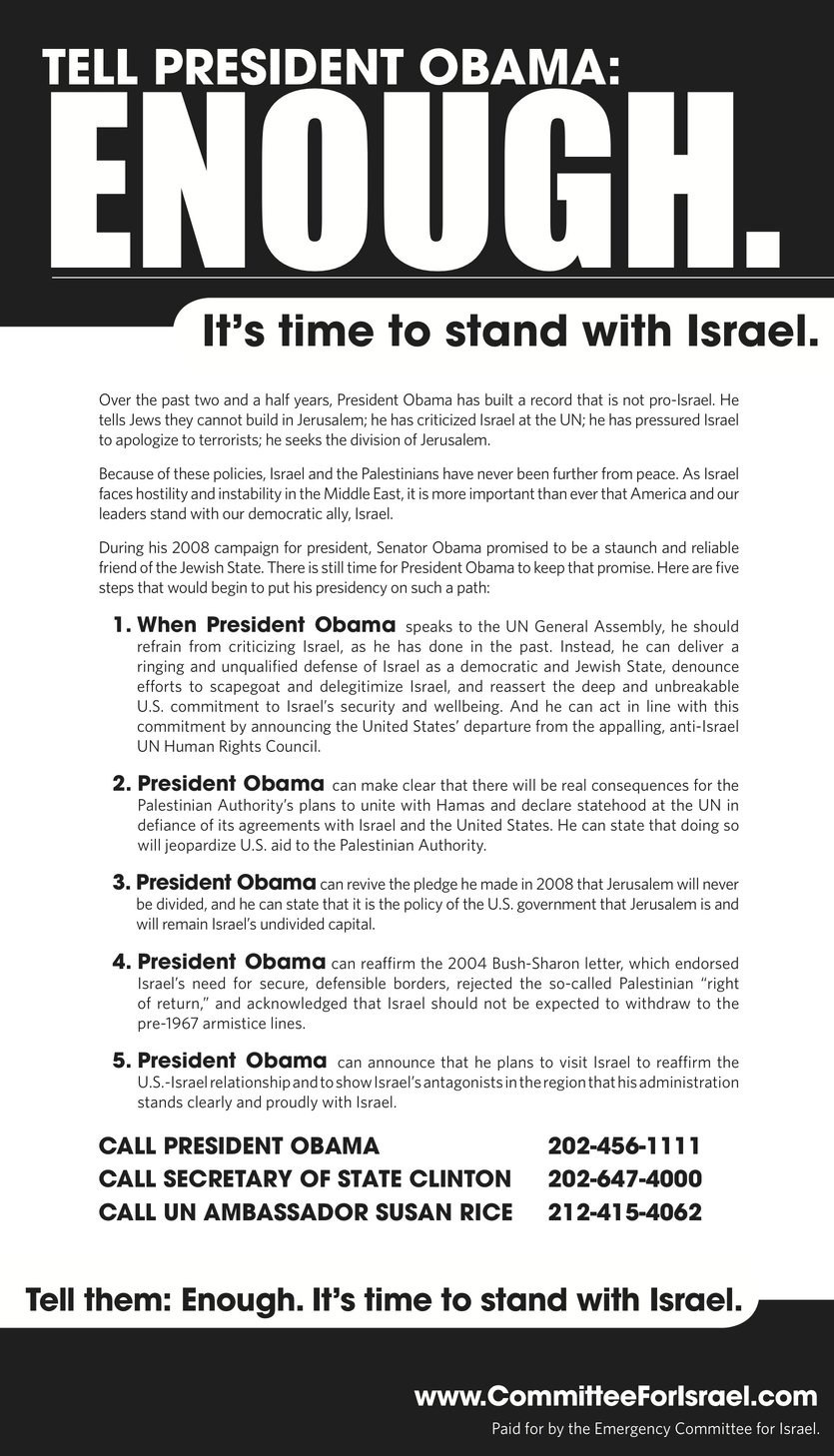 Blog : PhilosémitismePub pleine page pro-Israël dans le New York TimesRien de tel évidemment dans les journaux européens - ce serait peine perdue. Une pub pleine page de défense d'Israël est parue le New York Times, journal de gauche américain. Tell President Obama: ENOUGH. It's time to stand with Israel.Over the past two and a half years, President Obama has built a record that is not pro-Israel. He tells Jews they cannot build in Jerusalem; he has criticized Israel at the UN; he has pressured Israel to apologize to terrorists; he seeks the division of Jerusalem. Because of these policies, Israel and the Palestinians have never been further from peace. As Israel faces hostility and instability in the Middle East, it is more important than ever that America and our leaders stand with our democratic ally, Israel. During his 2008 campaign for president, Senator Obama promised to be a staunch and reliable friend of the Jewish State. There is still time for President Obama to keep that promise. Here are five steps that would begin to put his presidency on such a path: 1. When President Obama speaks to the UN General Assembly, he should refrain from criticizing Israel, as he has done in the past. Instead, he can deliver a ringing and unqualified defense of Israel as a democratic and Jewish state, denounce efforts to scapegoat and delegitimize Israel, and reassert the deep and unbreakable U.S. commitment to Israel's security and wellbeing. And he can act in line with this commitment by announcing the United States' departure from the appalling, anti-Israel UN Human Rights Council. 2. President Obama can make clear that there will be real consequences for the Palestinian Authority's plans to unite with Hamas and declare statehood at the UN in defiance of its agreements with Israel and the United States. He can state that doing so will jeopardize U.S. aid to the Palestinian Authority. 3. President Obama can revive the pledge he made in 2008 that Jerusalem will never be divided, and he can state that it is the policy of the U.S. government that Jerusalem is and will remain Israel's undivided capital. 4. President Obama can reaffirm the 2004 Bush-Sharon letter, which endorsed Israel's need for secure, defensible borders, rejected the so-called Palestinian ?right of return,? and acknowledged that Israel should not be expected to withdraw to the pre-1967 armistice lines. 5. President Obama can announce that he plans to visit Israel to reaffirm the U.S.-Israel relationship and to show Israel's antagonists in the region that his administration stands clearly and proudly with Israel. Call President Obama 202-456-1111 Call Secretary of State Clinton 202-647-4000 Call UN Ambassador Susan Rice 212-415-4062 Tell them: Enough. It's time to stand with Israel. H/T: RJ 5 commentaires