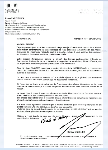 Blog : Victor PEREZRéponses à Jean GlavanySuite au Rapport de la mission d'information parlementairesur la géopolitique de l'eau, dont Jean Glavany fut le rapporteur, RenaudMuselier ainsi que Lionel Luca se désolidarisent totalement de l'encadréconcernant ??l'Apartheid israélien?? rajouté par le député PS. Lire à cesujet JeanGlavany et « l'Apartheid israélien ». Ci-dessous les deux lettres. Renaud Muselier se tournevers chacun et Lionel Luca vers son Excellence Mr Yossi Gal, Ambassadeurd'Israël en France. 5 commentaires
