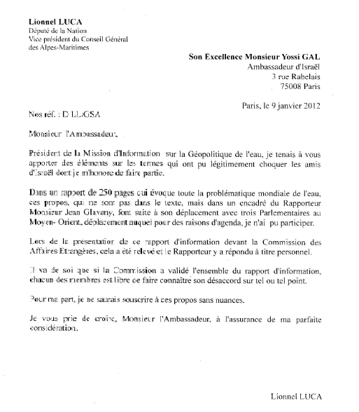 Je vous adresse, pour votre information copie de mon courrier à l’ambassadeur d’Israël à ce sujet.