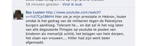 Blog : PhilosémitismeJeune politicien flamand regrette qu'Hitler n'a exterminé tous les Juifs"Hitler eût mieux fait de terminer le travail." On a l'habitude d'entendre des propos antisémites chez des Européens plus âgés. Dans le cas de Bas Luyten, même le Centre pour l'égalité des chances ( CECLR) qui véhicule lui-même ... des propos borderline au sujet des Juifs est intervenu. Mais la réalité est qu'on trouve au sein des "élites" belges des gens qui pensent que la petite communauté juive ("la mafia sioniste") met en danger la Belgique (Souhail Chichah, Pierre Piccinin, ONG, les médias, universités etc). Même le premier Ministre Elio Di Rupo y est allé de son couplet très hostile. Source: La Libre Belgique (Extraits) Vendredi matin, le nom de Bas Luyten, ex-collaborateur parlementaire de la N-VA, émergeait dans la presse flamande à propos du fameux courriel affirmant que le ministre flamand du Budget et des finances, Philippe Muyters avait menti (LLB du week-end). [...] selon le magazine flamand Joods Actueel, Bas Luyten aurait tenu sur sa page Facebook des propos d'une violence sans nom. Petit échantillon : "Je n'hésite pas à dire qu'au fil des jours, je suis confronté à des problèmes grandissants avec l'ensemble de la communauté juive. [ ] Hitler eût mieux fait de terminer le travail." Plus récemment, il a parlé de "Gestapo juive" à propos de Michaël Freilich, le rédac-chef de "Joods Actueel", qui envisage de se présenter à la présidence du CECLR [il est plus qu'évident qu'un Juif ne sera jamais nommé à ce poste]. Ces messages haineux ont entre-temps disparu mais dans une autre intervention, Bas Luyten s'était félicité "d'avoir offensé nombre de sionistes, ce qui ne constitue pas réellement un défi". | Membre Juif.org