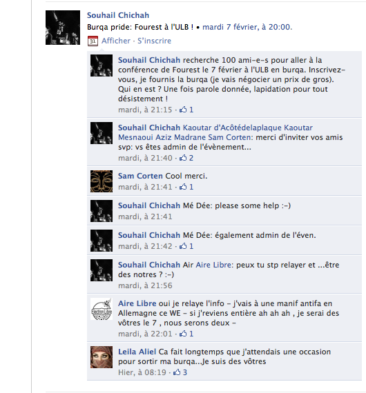 Blog : PhilosémitismeUniversité libre de Bruxelles: Caroline Fourest chahutée par Souhail ChichahUne fois de plus l'Université Libre de Bruxelles (ULB) se singularise. La politologue française Caroline Fourest devait y débattre hier de l'extrême droite et a en été empêchée par un groupe de musulmans menés par un membre du personnel de l'université Souhail Chichah. Caroline Fourest a confié "ne pas comprendre pourquoi ce genre de débordements n'a lieu qu'en Belgique. Je donne des conférences partout dans le monde, jamais rien n'arrive, sauf ici. Ces gens ont pris le pouvoir dans l'Université. Je n'y viendrai plus". - Faut-il rappeler que l'ULB est un vivier de militants anti-israéliens, membres de l'université et étudiants' - Faut-il rappeler que l'ULB a triste honneur d'être la seule université européenne où, à notre connaissance, un éminent professeur mondialement connu, Jacques Brotchi, a démissionné en raison d'incidents antisémites répétés' (Tolérance de l'antisémitisme à l'Université Libre de Bruxelles et démission du Prof. Brotchi) Tout ceci se passe dans l'indifférence générale et on voit le résultat maintenant. - Faut-il rappeler le rôle de Pierre Galand qui diabolise Israël depuis vingt ans en toute impunité et dont le dernière réalisation est le très coûteux et très fumeux tribunal Russell sur la Palestine? Le meneur de la "fronde" anti-Fourest est Souhail Chichah qui veut protéger les Belges du danger sioniste. Il n'a pas hésité à rabrouer le Roi Albert II de Belgique au sujet de "l'ethnocide gazaoui" et de "ses hôtes sionistes": "Certes Sire, je ne suis pour vous et votre cour au sang bleu qu'un allochtone venu du 'trou du cul du monde'. [...] A l'occasion de l'inauguration de la place Albert 1er de Belgique, en mémoire de votre aïeul qui "était semble-t-il fort intéressé par les questions relatives à la création d'un "foyer national juif" dans la région". [...] Tout comme moi, vous êtes descendant d'immigrés. Vous et moi sommes enfants de Chleuhs. Entre descendants de b(a/e)rb(a/e)res, nul besoin d'expliquer les enjeux symboliques de la mémoire". Dans la vidéo on voit le Professeur Guy Haarscher. Il s'est fait traiter sur Facebook de "suceur de b... sionistes va-t-en-guerre atlantiste" par un étudiant en sciences politiques qui promettait sur le réseau Facebook de "foutre le bordel" à une conférence, le 22 septembre, sur les révolutions arabes. Souhail Chichah et un certain Pierre Piccinin (qui n'aime ni la mafia sioniste ni le lobby juif international), avaient approuvé. Commentaire de Souhail Chichah sur la députée Viviane Teitelbaum: "Une vieille juive riche à pognon mais moche comme un rat mort ! heu pardon pour les rats je les aime bien'" et à une autre personne: "Dis Caroline, faut arrêter de te toucher ma chérie!" - Des étudiants de l'Université Libre de Bruxelles se plaignent des Juifs 3 commentaires