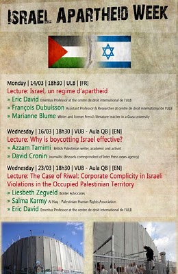 Blog : PhilosémitismeProf de l'Université Libre de Bruxelles ne diabolisera pas Israël à Paris VIIIL'université Paris 8 a retiré son autorisation à un colloque intitulé "Israël, Etat d'apartheid". Parmi les les intervenants à la conférence sur le boycott et l'apartheid des 27-28/2/2012 à Paris VIII on trouve le nom de François Dubuisson de l'Université Libre de Bruxelles. Source: CRIF (Bio des intervenants à la conférence sur le boycott et l'apartheid des 27-28/2/2012 à Paris VIII) Prof à l'ULB en droit international, spécialiste du droit de l'information et des nouvelles technologies. A écrit des articles sur la responsabilité d'Ariel Sharon lors des massacres de Sabra et Chatila. A participé à la session de 2009 du Tribunal Russell sur la Palestine [1] sur l'avis de la CIJ relatif à la barrière de sécurité de Juillet 2004 ("spécialiste des questions juridiques de la construction du mur"). Conseille les organisations pro-palestiniennes dont l'AFPS et la Délégation Générale de Palestine à l'UE sur l'illégalité du tramway de Jérusalem (affaire AFPS c/ALSTOM et Veolia) et les conséquences positives de la reconnaissance de la Palestine par les institutions internationales "de nouveaux outils contre l'occupation". Il tente d'exclure le Hamas de la liste des organisations terroristes de l'UE. En 2011, François Dubuisson avait participé à l'Israel Apartheid Week à l'Université Libre de Bruxelles. A l'Université Libre de Bruxelles on s'inquiète que le boycott d'Israël soit illégal en France. [1] Trois Belges francophones y ont participé dont Pierre Galand et François Dubuisson (tous deux liés à l'Université Libre de Bruxelles). | Membre Juif.org