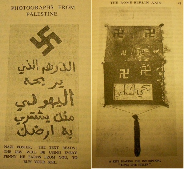 Blog : PhilosémitismePropagande antisémite de Mussolini et Hitler à l'intention des ArabesIl évoque les 25.000 nazis convertis qui seront envoyés comme ambassadeurs commerciaux et politiques. Deux centres furent créés à cette fin au Caire et à Bagdad - des enseignants et des employés de banque sont chargés de faire passer l'idéologie nazie dans la presse en langue vernaculaire [l'arabe], dans des cours d'allemand et par le cinéma. Leur autre outil est le Club arabe, el Nadi el Arrabi, une organisation pan-arabe dont les membres étaient issus de toutes les régions du Proche-Orient et d'Europe et qui a son QG sur le Kurfuerstendamm. Il montre des photos (ci-dessous) de cerfs-volants avec l'inscription "Longue vie à Hitler" et des posters avertissant: "Le Juif utilisera chaque sou qu'il gagnera grâce à vous pour acheter votre terre". Source: New English Review (The Attack Within by Elwyn Jones, par Esmeralda Weatherwax) En faisant une recherche sur Google, l'attention de Esmeralda Weatherwax fut attirée par une phrase dans un livre publié pendant l'été de 1939: "il a été décidé de "convertir" 25000 nazis au mahométisme. Ils seront incorporés à une organisation récemment créée, le Jamait-e-Muslimin, qui collabore déjà avec le Mufti, un leader des Arabes palestiniens". La citation provient d'un livre intitulé L'attaque de l'intérieur par Frederic Elwyn Jones. Celui-ci était Lord Chancelier en 1977, lorsque l'auteur de l'article a rejoint la fonction publique et demandé à être affectée au ministère du Lord Chancelier. Elle s'est procuré un exemplaire de l'ouvrage - une partie de l'article est consacrée à l'islam. Nous nous sommes concentrés sur l'implication de l'Allemagne et de l'Italie dans la diabolisation des Juifs auprès des Arabes. L'ouvrage fut publié par Penguin dans la collection Penguin Specials consacrée à des sujets de brûlants de l'actualité de l'époque. Les livres de cette collection étaient publiés dès que le manuscrit était terminé. Elwyn Jones, homme de gauche, était à l'époque un avocat de 30 ans qui connaissait bien l'Allemagne pour y avoir vécu. Il décrit l'expansion allemande et ses préparatifs pour parvenir à la domination du monde, et met l'accent sur la nécessité d'arrêter les méfaits du nazisme. Les références font penser que le livre a été publié début juin 1939, trois mois avant l'invasion de la Pologne et la déclaration de guerre à l'Allemagne. Un des sujets abordés sont les futures invasions/annexations par l'Allemage: après l'Autriche et la Tchécoslovaquie - la Pologne, la Roumanie ou les Pays-Bas, demande-t-il. Il considère qu'il y a de nombreuses similitudes entre le nazisme et l'islam. Dans le deuxième chapitre intitulé "L'axe Rome ? Berlin", il s'intéresse à la manière dont les fascistes semblent vouloir se partager l'Europe ? les Allemands veulent l'Europe du Nord et la Russie ? la Méditerranée deviendra "un lac italien" ? les Italiens peuvent bien vouloir les Balkans mais l'Allemagne a ses propres plans pour la région ? Franco a l'Espagne et est neutre mais les ports de la péninsule ibérique intéressent les Allemands, etc. Vers la fin du chapitre il déclare que le but de Mussolini est de conquérir l'Abyssinie pour contrebalancer la faiblesse italienne dans la partie orientale de la Méditerranée et il compte y arriver en établissant un empire dans la partie Est de l'Afrique du Nord. Mussolini se déclare "Protecteur de l'Islam" et intrigue en Syrie, Palestine et Libye contre la Grande-Bretagne et la France. Page 36: "Comme cela a été rapporté à la Chambre des communes le 16 février 1938, en Palestine, "des femmes italiennes étaient déguisées en dames charitables et en religieuses et distribuaient aux Arabes des photos truquées représentant des atrocités commises par des Juifs. Elles racontaient aux Arabes que leur pauvreté était due à la mauvaise gestion des Britanniques. Des camionnettes transformées en cinéma ambulant projetaient des films truqués où l'on voyait des Juifs tuer des Arabes. [...] Une radio italienne basée à Bari et captée en Palestine diffusait des programmes attractifs ponctués de slogans comme: "La Palestine appartient aux Arabes", "Tuez les Juifs", "Laissez les Arabes de Palestine se réarmer". Des activités similaires étaient organisées en Syrie." Il aborde la situation en Allemagne: "Alors que des synagogues sont brûlées en Allemagne une mosquée a été construite au coeur de Berlin, où des Musulmans font leurs dévotions. C'est une petite initiative dans le programme nazi pour s'attirer la sympathie des Arabes. Le Ministère de la Propagande de Goebbels professe avoir découvert un nombre de points communs entre la croyance nazie en l'usage de l'épée et les enseignements du prophète Mahomet ". (p. 43) ll évoque ensuite les 25.000 convertis nazis qui seront envoyés comme ambassadeurs commerciaux et politiques. Deux centres furent créés à cette fin au Caire et à Bagdad - des enseignants et des employés de banque seront chargés de faire passer l'idéologie nazie dans la presse en langue vernaculaire [l'arabe], dans des cours d'allemand et par le cinéma. Leur autre outil est le Club arabe, el Nadi el Arrabi, une organisation pan-arabe dont les membres étaient issus de toutes les régions du Proche-Orient et d'Europe et qui a son QG sur le Kurfuerstendamm. Il montre des photos de cerfs-volants avec l'inscription "Longue vie à Hitler" et des posters avertissant: "Le Juif utilisera chaque sou qu'il gagnera grâce à vous pour acheter votre terre". "Une édition en arabe de Mein Kampf a paru en 1939. La photo d'Hitler est sur la couverture, sous le titre ?L'Homme le Plus Fort dans le Monde'. Hitler a pris soin de retirer de l'édition arabe le passage où il place les Arabes dans 'une catégorie raciale inférieure'" (pg. 45) Mein Kampf est resté très populaire jusqu'à présent en Egypte et en Turkey. | 