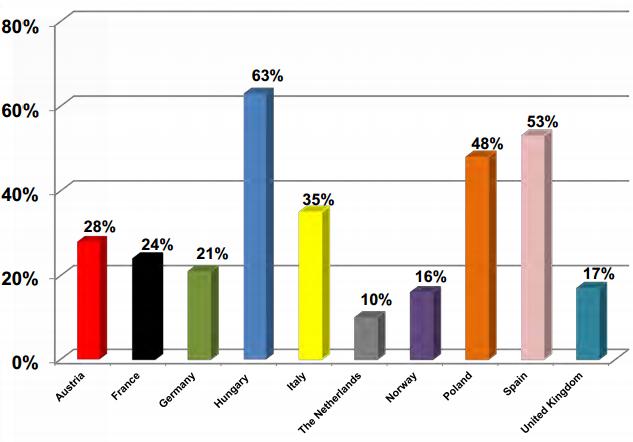 Blog : PhilosémitismeL'antisémitisme en Europe atteint des "niveaux très inquiétants"Une étude réalisée par l'Anti-Defamation League dans dix pays européens révèle la persistance de préjugés antisémites multiséculaires chez des millions d'Européens. "Des attitudes antisémites dans dix pays européens restent à "des niveaux très inquiétants", selon un nouveau sondage de l'Anti-Defamation League (ADL) publié le 20 mars, avec de larges pans de la population souscrivant à notions antisémites classiques telles que les Juifs ont trop de pouvoir dans les affaires, sont plus loyaux envers Israël qu'envers leur propre pays, ou "parlent trop" au sujet de ce qui s'est passé pendant l'Holocauste." On notera que l'antisémitisme est nettement plus élevé dans les pays européens catholiques... Pourcentage des personnes qui ont répondu positivement à au moins trois des quatre questions suivantes: 1. les Juifs sont plus loyaux envers Israël que le pays ce pays [où ils vivent]. 2. les Juifs ont trop de pouvoir dans le monde des affaires 3. les Juifs ont trop de pouvoir sur les marchés financiers internationaux 4. les Juifs parlent encore trop de l'Holocauste Pays-Bas: 10% Norvège: 16% Royaume-Uni: 17% (10% en 2009) Allemagne: 21% (20% en 2009) France: 24% (21% en 2009) Autriche: 28% (30% en 2009 - la seule baisse constatée) Italie: 35% Pologne: 48% (pas de changement) Espagne: 53% (48% en 2009) Hongrie: 63% (47% en 2009) Pourcentage de personnes interrogées qui ont répondu qu'il est "probablement vrai" que "les Juifs sont plus loyaux envers Israël que le pays où ils vivent": Allemagne: 52% (53% en 2009 et 51% en 2007) Autriche: 47% (47% en 2009 et 54% en 2007) France: 45% (38% en 2009 et 39% en 2007) Espagne: 72% (64% en 2009 et 60% en 2007) Hongrie: 55% (40% en 2009 et 50% en 2007) Italie: 61% Norvège: 58% Pays-Bas: 47% Pologne: 61% (63% en 2009 et 59% en 2007) Royaume-Uni: 48% (37% en 2009 et 50% en 2007) Pourcentage de personnes interrogées qui ont répondu qu'il est "probablement vrai" que "les Juifs ont trop de pouvoir dans le monde des affaires": Allemagne: 22% (21% en 2009 et 2007) Autriche: 30% (36% en 2009 et 37% en 2007) Espagne: 60% (56 en 2009 et 53% en 2007) France: 35% (33% en 2009 et 28% en 2007) Hongrie: 73% (67% en 2009 et 60% en 2007) Italie: 39% Norvège: 21% Pays-Bas: 10% Pologne: 54% (55% en 2009 et 49% en 2007) Royaume-Uni: 20% (15% en 2009 et 22% en 2007) Pourcentage de personnes interrogées qui ont répondu qu'il est "probablement vrai" que "les Juifs ont trop de pouvoir sur les marchés financiers internationaux" : Allemagne: 24% (22% en 2009 et 25% en 2007) Autriche: 38% (37% en 2009 et 43% en 2007) Espagne: 67% (74% en 2009 et 68% en 2007) France: 29% (27% en 2009 et 28% en 2007) Hongrie: 75% (59% en 2009 et 61% en 2007) Norvège: 23% Pays-Bas: 17% Pologne: 54% (54% en 2009 et 2007) Royaume-Uni: 22% (15% en 2009 et 21% en 2007) Pourcentage de personnes interrogées qui ont répondu qu'il est "probablement vrai" que "les Juifs parlent trop de l'Holocauste": Allemagne: 43% (45% en 2009 et 45% en 2007) Autriche: 45% (55% en 2009 et 54% en 2007) Espagne: 47% (42% en 2009 et 46% en 2007) France: 35% (33% en 2009 et 40 % en 2007) Hongrie: 63% (56% en 2009 et 58% en 2007) Italie: 48% Norvège: 25% Pays-Bas: 31% Pologne: 53% (55% en 2009 et 58% en 2007) Royaume-Uni: 24% (20% en 2009 et 28% en 2007) La marge d'erreur est +/- 4.43 et +/- 4.85. ADL Survey In Ten European Countries Finds Anti-Semitism At Disturbingly High Levels | Membre Juif.org