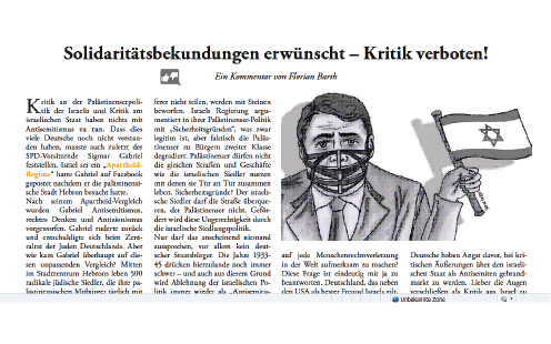 Blog : PhilosémitismeJournal universitaire allemand qualifie Israël de "régime d'apartheid"L'étudiant qui a dénoncé l'article s'est dit était "choqué" et qu'en général ce type de critiques émane de l'extrême droite et que l'article et le dessin répandent l'idée qu'Israël est un État qui pratique l'apartheid. L'étudiant a souhaité garder l'anonymat en raison de la présence de groupes néo-nazis et de l'hostilité contre Israël qui règne dans la région. Il a ajouté qu'il est "sensibilisé aux manifestations d'antisémitisme" et considère que l'article et la caricature sont l'expression contemporaine de la haine du Juif. Contexte: Le président du PS allemand (et possible futur chancelier) accuse Israël d'"apartheid" Source: Jerusalem Post (German college article labels Israel ?apartheid', par Benjamin Weinthal, 04/01/2012) Le journal d'une université allemande a publié un article défendant l'emploi du qualificatif "régime d"apartheid" pour désigner le gouvernement d'Israël par le président du Parti Socialiste allemand (Parti social-démocrate d'Allemagne (SPD)) Sigmar Gabriel. L'article paru dans Novum (28 mars) est accompagné d'un portrait de Sigmar Gabriel muselé comme un chien, ce qui suggère que la critique d'Israël est interdite dans la République fédérale. L'auteur de l'article, Florian Barth, a écrit que "la critique de la politique israélienne envers les Palestiniens et la critique de l'état israélien n'ont rien à voir l'une avec l'autre". L'article et la caricature ont fait l'objet de critiques de la part de la communauté juive de Dresde, dont les locaux sont siutés près de la Hochschule Mittweida - Université des Sciences Appliquées, dans le Land de Saxe. Heinz Joachim Aris, le porte-parole de la communauté juive de Dresde, a déclaré que l'article est basé sur des "préjugés" contre Israël. Il a qualifié le commentaire d'inapproprié et déclaré que les attaques de Sigmar Gabriel contre Israël "ne sont pas acceptables" car elles suscitent des sentiments négatifs contre l'Etat juif. Il a ajouté que dans la ville de Mittweida il y a de nombreuses manifestations néo-nazies. Ludwig Hilmer, qui donne cours sur les médias et les communication au Mitweida et qui est responsable de l'hebdomadaire, a déclaré au Post qu'il était en Israël pendant le processus d'élaboration du journal et qu'il n'aurait pas autorisé la publication de l'article. Il a indiqué que Barth est un jeune étudiant d'une vingtaine d'années et qu'il n'est pas familiarisé avec l'histoire de l'antisémitisme contemporain en Allemagne. Hilmer s'est entretenu avec Barth au sujet de l'article. Selon Hilmer, la circulation des Novum est d'environ 1000 et la publication a un site Web où les lecteurs peuvent consulter les articles en format PDF. Hilmer était à Haïfa en mars pour faire avancer la coopération entre le Technion et l'université de Mittweida. La controverse a éclaté lorsqu'un étudiant de Mittweida, choqué par l'article, l'a transmis à Sacha Stawski, le rédacteur en chef de Honestly Concerned. "Une grande partie de l'antisémitisme présent dans l'ensemble de la société ("mainstream") et qui fait désormais partie de notre vie quotidienne, est centré autour de l'accusation selon laquelle un lobby magique [juif] essaye de faire taire toute critique justifiée d'Israël, en prétendant que la critique est antisémite", a confié Stawski au JPost. "En fait, c'est une des accusations les plus courantes portées contre les amis d'Israël - le plus souvent par les antisionistes et des antisémites: la supposée influence du 'club qui accuse les autres d'anti-sémitisme'." L'étudiant qui fut le premier à envoyer l'article à Stawski a confié au Post qu'il était "choqué" par l'article et qu'en général ce type de critiques émane de l'extrême droite et que l'article et le dessin répandent l'idée qu'Israël est un État qui pratique l'apartheid. L'étudiant a souhaité garder l'anonymat en raison de la présence de groupes néo-nazis et de l'hostilité contre Israël qui règne dans la région. Il a ajouté qu'il est "sensibilisé aux manifestations d'antisémitisme" et considère que l'article et la caricature sont l'expression contemporaine de la haine du Juif. Stawski, qui préside l'ONG qui analyse l'antisémitisme dans la presse allemande, a déclaré: "L'accusation dans cet article est que les amis d'Israël intimident les critiques d'Israël en les accusant d'être antisémites, tentant par cette supposée démarche museler toute critique de l'Etat juif". Pour lui cette approche constitue "un moyen idéal pour éviter d'avoir à débattre des faits". 3 commentaires