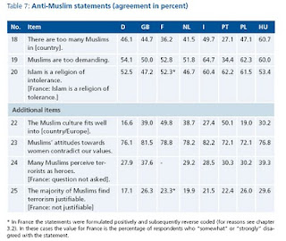 Blog : PhilosémitismePour un tiers des Français il y a trop de musulmans en FranceLa fondation Friedrich Ebert a publié un rapport Intolerance, Prejudice and Discrimination, A European Report. Selon les conclusions de l'étude il est clair que les Européens sont largement unis dans leur rejet des musulmans et de l'islam. Les pays où ce rejet est le plus significatif sont l'Allemagne, la Hongrie, l'Italie et la Pologne, suivis de près par la France, la Grande-Bretagne et les Pays-Bas. C'est au Portugal qu'on trouve le sentiment le moins hostile aux musulmans (il y a très peu de musulmans au Portugal - environ 40.000). En termes absolus, cependant, le niveau de préjugés envers les musulmans connaît peu de variation dans les huit pays où l'étude a été menée. Nous avons déjà évoqué la perception que les Européens ont des Juifs ICI. Pour une majorité d'Européens l'islam est une religion intolérante: 53% en Allemagne; 47% en Grande-Bretagne; 52% en France; 47% aux Pays-Bas; 60% en Italie; 62% au Portugal; 61% en Pologne et 53% en Hongrie. La France se classe dans la moyenne européenne. Il est donc faux d'accuser Nicolas Sarkozy d'être responsable de la perception globalement négative de l'islam, puisque, comme le montre le rapport, elle est sensiblement similaire dans les huit pays européens où l'enquête a été conduite. 36% des Français estiment qu'il y a trop de musulmans en France (le niveau le plus bas avec le Portugal ); 53% qu'ils ont trop de demandes; 52% que l'islam est une religion intolérante; 50% que la culture musulmane s'accorde bien (fits well) avec les valeurs françaises (encore une fois la France enregistre avec le Portugal les résultats les plus positifs); 79% que l'attitude des musulmans envers la femme sont en contradiction avec les valeurs françaises; 23% que la majorité des musulmans trouve que le terrorisme est justifiable. Une question n'a pas été posée en France: beaucoup de Musulmans perçoivent les terroristes comme des héros. H/T: Islam in Europe (EU: Half of Europeans say Islam is a religion of intolerance) | Membre Juif.org
