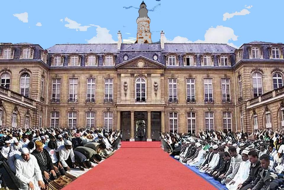 Blog : Rencontre Judaïque FMA propos d'une photo haineuse ...C'est un photo montage qui circule sur le WEB, et qui ravit ceux qui haïssent, soyons clair, non pas les islamistes radicaux, non pas les intégristes musulmans, mais toutes celles et ceux associé(e)s - et quelle que soit leur pratique -, à cette religion. La cour de l'Elysée transformée en cour de Mosquée géante, et le tapis rouge transformé en tapis de prière, voilà ce qui en fait ricaner certains ... mais pas moi. Je n'ai pas aimé, non plus, les drapeaux tunisiens, algériens, marocains, palestiniens qui ont été brandis - avec ceux de pays non arabes, reconnaissons-le aussi - sur la Place de la Bastille, le soir du 6 mai. Maladresse, provocation ? On sait que l'écrasante majorité du vote musulman est allé à François Hollande, et sur ce sujet je reviendrai dans un article particulier consacré à Nicolas Sarkozy, et qui sera publié vendredi. Que certains aient brandi ces drapeaux comme une manifestation, débile, de "revanche", c'est certain. Mais que cela serve à alimenter les fantasmes racistes de ceux qui nous prédisent une "islamisation" de la France, je le refuse aussi, catégoriquement. Et aucune bonne raison, même mon attachement viscéral à la survie et à la sécurité d'Israël ne me fera changer d'avis sur ce point ! | Membre Juif.org