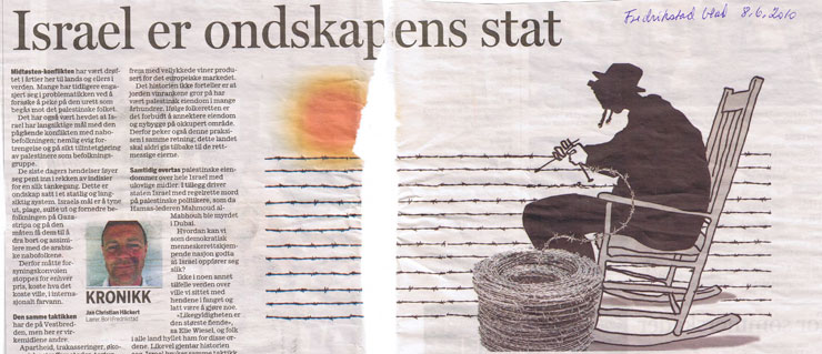 Blog : PhilosémitismeIsraël est le pays du mal, caricature norvégienneL'excellent blog Norway, Israel and the Jews publie cette caricature anti-israélienne qui a paru dans le journal Frederiks blad lors de l'opération terroriste du Mavi Marmara. Le blog la publie pour démontrer l'attitude de la presse (et de la classe politique norvégienne) lorsqu'il s'agit de propos qui fâchent l'islam, mais lorsqu'on s'attaque aux Juifs israéliens on y va gaîment dans l'incitation à la haine. Un bel exemple de deux poids deux mesures. Lors des émeutes anti-juives en 2009 à Oslo on hurlait demandait qu'on égorge les Juifs (Khaybar, Khaybar). Cette caricature avait été publiée en 1992 dans l'Aftenposten. L'auteur est Ulf Aas et elle illustrait un article de Magne Skjæråsen. Le dessin représente un rat assis devant une étoile de David accompagné de la légende "Une meilleure race d'hommes". | Membre Juif.org