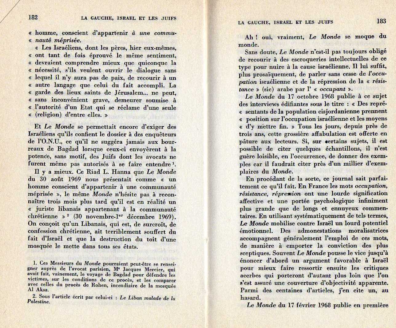 Blog : Victor PEREZLa Gauche, Israël et les JuifsLe chapitre X du livre de Jacques Hermone, titré « La Gauche, Israël et les Juifs » et paru en 1970, est intitulé « Le Monde se moque du monde ». Un chapitre consacré au seul tabloïd Le Monde et à son hostilité systématique envers l'état juif dans les années soixante. Des méthodes et des termes choisis que chacun retrouve de nos jours, quatre décennies plus tard, sous la plume des ??envoyés'? spéciaux ou permanents en terre sainte et autres ??analystes'? attitrés du journal. Ci-dessous les pages scannées de ce chapitre si lucide quant à l'idéologie fétide qui mène ce quotidien. Un livre que chacun peut, encore aujourd'hui, commanderà la Fnac pour 6.37? port compris. Merci à Giora Hod de nous l'avoir fait (re) découvrir. | Membre Juif.org