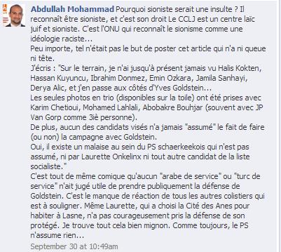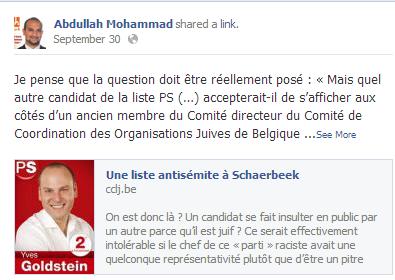 Blog : PhilosémitismeAucun "arabe de service" ou "turc de service" ne prend la défense de Goldstein (élections belges)"[..]faire passer Goldstein comme une victime car il serait "attaqué" pour ses origines juives, c'est plus que de la malhonnêteté, c'est une vieille technique sioniste justement, à savoir amalgamer juif et sioniste ou sionisme..." (Mohsin Mouedden, journaliste) Repris de la page Facebook de Abdullah Mohammad, conseiller communal CDH et candidat aux élections (il prétend que la victimisation est une tradition juive depuis trois millénaires): "Pourquoi sioniste serait une insulte' Il reconnaît être sioniste, et c'est son droit Le CCLJ est un centre laïc juif et sioniste. C'est l'ONU qui reconnaît le sionisme comme une idéologie raciste... Peu importe, tel n'était pas le but de poster cet article qui n'a ni queue ni tête. J'écris : "Sur le terrain, je n'ai jusqu'à présent jamais vu Halis Kokten, Hassan Kuyuncu, Ibrahim Donmez, Emin Ozkara, Jamila Sanhayi, Derya Alic, et j'en passe aux côtés d'Yves Goldstein... Les seules photos en trio (disponibles sur la toile) ont été prises avec Karim Chetioui, Mohamed Lahlali, Abobakre Bouhjar (souvent avec JP Van Gorp comme 3iè personne). De plus, aucun des candidats visés n'a jamais "assumé" le fait de faire (ou non) la campagne avec Goldstein. Oui, il existe un malaise au sein du PS schaerkeekois qui n'est pas assumé, ni par Laurette Onkelinx ni tout autre candidat de la liste socialiste." C'est tout de même comique qu'aucun "arabe de service" ou "turc de service" n'ait jugé utile de prendre publiquement la défense de Goldstein. C'est le manque de réaction de tous les autres colistiers qui est à souligner. Même Laurette, qui a choisi la Cité des Anes pour habiter à Lasne, n'a pas courageusement pris la défense de son protégé. Je trouve tout cela bien mignon. Comme toujours, le PS n'assume rien..." Mohsin Mouedden "[...] les 4/5 des juifs de Belgique sont plutôt content du sort des musulmans, dès lors affirmer avec un tel aplomb une telle phrase n'est pas seulement un mensonge, mais confirme que certains sont prêts à raconter n'importe quoi pour faire du sionisme, une idéologie "normale" comme dirait l'autre président LOL, en outre, le sionisme est une trahison du judaisme, le sionisme est une idéologie communautariste et colonialiste, dès lors nous ne pouvons accepter de n'y voir qu'un terme ambigue, car si au début, il était plutôt un nationalisme communautaire ou de "libération", dans les faits, mon cher Xavier, le sionisme est bien un projet communautariste, ethniciste et raciste, dès lors se considérer comme sioniste c'est participer à un projet anti humaniste et anti-démocratique, simpliste' Maintenant il y a différents sionismes, celui du CCLJ n'est pas le plus honorifique, puisqu'il instrumentalise les valeurs de gauche et la laicité pour se donner une image de propreté, là ou le sioniste de droite et d'extrême-droite parait comme insupportable. Enfin et pour terminer, le problème qui nous concerne ici n'est pas Goldstein ou Jacques, mais le fait que dans une commune pareille, la "dame de fer" continue à percevoir les "bougnouls" comme des "tirailleurs" prêts à se sacrifier pour celui qui ne sera certainement pas notre allié, sur les questions des libertés religieuses notamment... Sinon comme le fait le CCLJ maladroitement, à savoir faire passer Goldstein comme une victime car il serait "attaqué" pour ses origines juives, c'est plus que de la malhonnêteté, c'est une vieille technique sioniste justement, à savoir amalgamer juif et sioniste ou sionisme..." Parti politique belge: "l'ISLAM existe depuis 14 milliards d'années"Elections belges: la folie antisioniste bat des recordsElections: la folie antisioniste à Bruxelles circule au sein de l'Oumma'Nazis et Juifs 'la même race', selon le Vert belge Soufiane NajiBruxelles: élections et antisémitisme (encore et encore) | Membre Juif.org