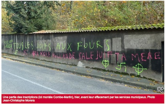 Blog : PhilosémitismeLes Juifs européens doivent cesser d'avoir la tête dans le sableInstead of serving as a wake-up call, the massacre at a Jewish school in Toulouse, France, generated greater violence against Jews and led to the exposure of terrorist cells preparing to murder Jews. (Image: Rhône. Des tags antisémites et pro-Merah découverts hier matin à Caluire-et-Cuire) Il est temps que les Juifs européens cessent d'avoir leur tête dans le sable et se rendent compte de certaines réalités très déplaisantes. Néo-nazis européensIsi Leibler @ Algemeiner: The time has come for European Jews to pull their heads out of the sand, face reality and ask themselves honestly whether their children can possibly remain proud Jews in societies which have reverted to treating them as pariahs. Less than 70 years ago the soil of Europe was drenched in Jewish blood. Under the leadership of Germany, considered the most cultured country in Europe, six million Jews were brutally murdered in a meticulously planned genocidal campaign. The vast majority of Germans and citizens of Nazi-occupied territories either collaborated or looked the other way as millions of their Jewish neighbors were deported and systematically exterminated. [Des Belges hurlent: "Hamas, tous les Juifs au gaz"] After that terrible era, the call went out: Never again. Yet only several decades later, the evil winds of visceral anti-Semitism are again raging throughout Europe, with the difference being that the nation state of the Jews is now the surrogate for the conventional demonization of individual Jews. For many Jews, this now directly affects the fundamental quality of their daily secular and interpersonal lives. The great source of concern is the extent to which indigenous Europeans have revived the hostility and prejudice deeply embedded in their religion and culture, which many mistakenly believed had been permanently excised after the horrors of the Holocaust. Furthermore, in most European countries, Muslim immigrants in escalating numbers are assuming an increasingly more powerful role in society and politics. They have imported vile concepts originating from their former anti-Semitic society and culture, imitating and even exceeding obscene Nazi propaganda. This is exemplified by the portrayal of Jews killing Muslim children to obtain their blood to bake matzot, or mullahs calling on the faithful to murder the Jewish descendants of apes and pigs. Not surprisingly, Muslim immigrants are also disproportionately involved in the surge of physical violence targeting Jews. European opinion polls express a contemporary version of this approach when they explicitly regard Israel as the greatest threat to global peace and stability ? exceeding North Korea, Iran or Syria. What is this, if not a 21st century rendition of the medieval hatred in which Jews were viewed as Satan's representatives on earth and blamed for natural disasters such as earthquakes, plagues and poisoned wells' The more sophisticated indigenous European version targets the nation state of the Jews, defaming Israel's army ? the most humane military force in the world ? accusing it of war crimes, of deliberately killing children, and even behaving like Nazis. Holocaust inversion has now penetrated the mainstream and become a major vehicle promoting hatred of Jews and diverting European guilt for the Holocaust by obscenely accusing its survivors of engaging in similar genocidal activities. [...] While Arab states like Syria blatantly butcher their citizens en masse, the spotlight remains centered on condemning Israel's efforts to defend itself from neighbors seeking its destruction. It is no exaggeration to describe the situation as worse than in the 1930s. Back then, the Jews could at least rely on liberals or segments of the Left to support them against the Nazis. Alas, today, these groups frequently lead the anti-Semitic pack. One need only observe the European media and the vicious online comments endorsing anti-Jewish attacks to appreciate how the levels of anti-Semitic paranoia now directly impact the fundamental quality of their daily lives. In ?polite' society and among the so-called enlightened intelligentsia, this is rationalized as postmodernism combined with extraordinary guilt about Europe's colonial past. These concepts have assumed a crucial role in European thinking and are frequently employed as a rationale for demonizing Israel as a colonial implant. What is particularly shocking is the extraordinary growth of popular anti-Semitism among the Left and Right, even in Germany, a country which obviously has a special obligation to distance itself from any vestige of anti-Semitism. Günter Grass' extraordinarily crude outburst against Israel elicited a huge groundswell of popular support. The German government attempted to resist these elements, but when a state-funded Jewish museum invites as its guest a woman who justifies Hezbollah and Hamas and promotes boycotts, divestment and sanctions against Israel, the impact of the radical anti-Jewish currents on institutions is only too evident. European Jews today do not merely confront a hostile anti-Jewish media. They face increasing violence and even murder. Instead of serving as a wake-up call, the massacre at a Jewish school in Toulouse, France, generated greater violence against Jews and led to the exposure of terrorist cells preparing to murder Jews. There are ongoing anti-Israeli demonstrations in which signs and chants of ?gas the Jews,? ?Hitler was right' or ?slit the throats of Jews' are everyday events, and anti-Semitism is escalating not only in France but in the U.K., Sweden, Hungary, Germany and throughout most of Europe. The fact that Jewish children are increasingly encountering anti-Semitism in schools and Jews are becoming progressively regarded as detestable pariahs is not all. Today, in many European countries, there is ever-growing agitation to ban circumcision and Jewish ritu