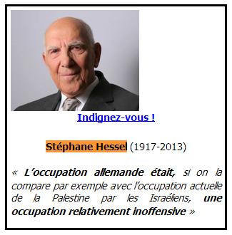 Blog : PhilosémitismeUn parti belge cite Stéphane Hessel pour minimiser la ShoahLe parti belge francophone Islam, qui a des élus à Bruxelles (Redouane Ahrouch à Anderlecht et Lhoucine Aït Jeddig à Molenbeek) publie sur son blog la célèbre phrase de l'icône française Stéphane Hessel sur l'occupation allemande: "L'occupation allemande était, si on la compare par exemple avec l'occupation actuelle de la Palestine par les Israéliens, une occupation relativement inoffensive". Stéphane Hessel fait l'objet d'un culte et d'une dévotion incroyables en Belgique francophone, au point que le premier ministre belge Elio di Rupo s'est rendu à ses obsèques. Il était le président d'honneur du pseudo Tribunal Russell sur la Palestine, fondé par l'ancien sénateur socialiste et Israël-basher Pierre Galand. 3 commentaires
