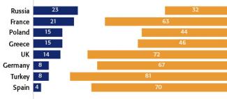 Blog : PhilosémitismeBBC: la France et l'Allemagne sont très hostiles à IsraëlLa BBC World Service a publié son dernier sondage concernant la perception de influence qu'exercent plusieurs pays dans le monde, dont Israël. On notera: (1) qu'on n'a pas demandé aux sondés leur opinion sur aucun pays arabe (le plus grand des hasards, n'est-ce pas'); (2) l'opinion très négative que les Européens ont d'Israël; (3) que pour la BBC la Turquie est un pays européen et on ne sera pas surpris d'apprendre que 81% des Turcs ont une mauvaise image d'Israël; (4) qu'on n'a pas non plus demandé aux Européens ce qu'ils pensent de la Turquie. Quant aux résultats on notera que la Russie est le pays les plus favorable à Israël avec 23% d'opinions positives et 32% négatives, suivie par la Pologne et la Grèce. Les pays les plus hostiles à Israël - réponses négatives - sont: le Royaume-Uni 72%, l'Espagne 70%, l'Allemagne 67% et la France 63%. | Membre Juif.org