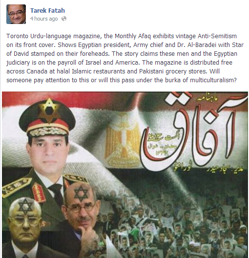 Blog : PhilosémitismeUn complot juif dénoncé dans des épiceries pakistanaises au Canada...@ Tundra Tabloids Tarek Fatah rapporte sur Facebook que les portraits du président égyptien par intérim (Adli Mansour), du chef de l'armée (le général al-Sisi) et de Mohamed El Baradei avec l'étoile de David estampillée sur leurs fronts sont sur la couverture du mensuel en ourdou Afaq publié à Toronto. Il s'agit d'un cas d'antisémitisme classique, commente Tarek Fatah. L'article prétend que ces personnalités et le système judiciaire égyptien sont à la solde d'Israël et de l'Amérique. Le magazine est distribué gratuitement à travers le Canada dans des restaurants islamiques halal et des épiceries pakistanaises. Tarek Fatah se demande si quelqu'un va réagir ou si cette affaire finira sous la burka du multiculturalisme. Bonne question! Un lecteur nous signale que le Pakistan est Juden-rein! - Par ailleurs, selon l'ONU, en Irak, dont on parle peu, la violence a atteint des sommets au mois de juillet: 1.507 morts et 2.326 blessés. (NYT) - Et encore par ailleurs, selon un expert en racisme, Patrick Chalier, les Belges sont obsédés par l'Islam. (LLB) | Membre Juif.org