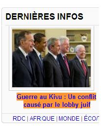 Blog : PhilosémitismeGuerre au Kivu : Un conflit causé par le lobby juif (Kongo Times)Daniel Mamba Tshiamba @ Kongo Times (signalé par DJP) "Avant de condamner les USA il faut en savoir le mode opératoire aussi bien pour leur peuple que pour le monde entier. Les USA sont controlés par les cartels puissants des riches et non necessairement par le Gouvernement. Les preuves sont multiples en soutient à notre constat. Le conflit congolais avec le Rwanda et l'Ouganda est plus causé par le lobby juif avec des amis américains et autres internationaux dont certains se retrouvent dans l'Administration politique Américaine, Britanique, Canadienne, Allemande, Belge, Sud Africaine etc. Et le Président des USA à lui seul et quelques uns de ses collaborateurs ne peuvent pas évincer ces cartels puissants. C'est pourquoi tous ceux et celles qui défilent auprès de l'administration Américaine pour espérer prendre le pouvoir en RDC perdent leur temps et leur énergie. Par contre si le people congolais se décide et se soulève contre les forces négatives au pays, et vu le niveau actuel de la diplomatie de la Diaspora congolaise, il y a beaucoup d'espoir pour réussir. Courage! LU POUR VOUS "Crimes organisés en Afrique centrale" & Guerres et massacres au Congo: faut-il «surveiller» les Américains' [...]" Une recherche sur Kongo Times révèle des propos antisémites fréquents comme ceux qu'on a l'habitude de lire en Belgique, ancienne puissance colonisatrice du Congo. 2 commentaires