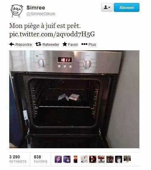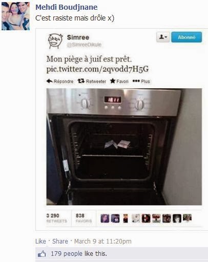 Blog : PhilosémitismePhoto sur Facebook: "Mon piège à juif est prêt"Trouvé sur la page Facebook du groupe belge francophone destiné aux jeunes Procit. L'individu (Mehdi Boudjnane) qui a posté la photo reconnaît que "C'est rasiste mais drôle x)". Vous remarquerez les deux billets de banque dans le four pour l'appropriation desquels les Juifs feraient n'importe quoi, vraiment n'importe quoi - même pour quelques sous. On notera que 179 jeunes Belges francophones apprécient ce post et que les gestionnaires du groupe (qui compte 40.000 membres) n'ont rien trouvé de choquant. Inutile de dire que seuls les Juifs font l'objet d'un tel type d'humour. D'autres membres du groupe ont posté les images suivantes: | Membre Juif.org