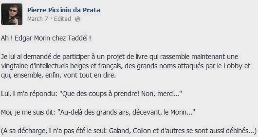 Blog : PhilosémitismeEdgar Morin a peur du Lobby malgré "ses grands airs", selon Pierre Piccinin"Une vingtaine d'intellectuels belges et français, des grands noms attaqués par le Lobby et qui, ensemble, enfin, vont tout en dire. [...] Toute sa force [du Lobby] réside dans notre peur." "Attaqué, une fois de plus, lâchement, par la mafia sioniste, je n'ai pas peur. Et un jour la peur changera de camp et ce sont eux qui en auront à rendre des comptes." Pierre Piccinin, est un pourfendeur de la "mafia sioniste". Cet enseignant publia cette remarque à l'occasion de la tuerie de Toulouse: "Si 4 enfants juifs méritent une minute de silence, les enfants palestiniens méritent qu'on se taise à jamais... faites passer ce message qu'il arrive aux juifs". Ces propos et d'autres ne gênent ni ses employeurs ni ses collègues enseignants (Athénée Royal Jean Rostand de Philippeville, Ecole européenne, le ministère de l'Education), ni la RTBF dont elle salue le courage et la détermination qui "forcent le respect", ni la presse écrite. Le 7 mars M. Piccinin fait part sur Facebook de son indignation face au refus d'autres Israël-bashers belges francophones comme Pierre Galand et Michel Collon se soient "débinés" à la perspective de de participer à un ouvrage collectif et révolutionnaire qui va définitivement permettre à des victimes du 'Lobby' de le démasquer. Mais son reproche principal va à Edgar Morin. Malgré ses "grands airs" chez Taddéï [...] "le Morin" a peur de prendre des coups du 'Lobby' (7 mars): "Ah ! Edgar Morin chez Taddéï! Je lui ai demandé de participer à un projet de livre qui rassemble maintenant une vingtaine d'intellectuels belges et français, des grands noms attaqués par le Lobby et qui, ensemble, enfin, vont tout en dire. Lui, il m'a répondu: "Que des coups à prendre! Non, merci..." Moi, je me suis dit: "Au-delà des grands airs, décevant, le Morin..." (A sa décharge, il n'a pas été le seul: Galand, Collon et d'autres se sont aussi débinés...)" Il précise également: "C'est précisément là l'erreur : en jouant le jeu du Lobby, le jeu de la peur, celui du terrorisme intellectuel, on encourage le Lobby et le renforce. Par contre, si d'aucuns commençaient à dire ouvertement les choses, systématiquement et partout, le Lobby n'aurait très rapidement plus aucune emprise. Toute sa force réside dans notre peur." 2 commentaires