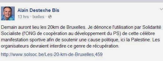 Blog : PhilosémitismeIsraël-bashing: le sénateur Alain Destexhe dénonce la politisation des 20km de Bruxelles par les Socialistes belgesSur Facebook le sénateur Alain Destexhe, vrai politicien et homme de convictions, dénonce la politisation par les Socialistes belges francophones d'un événement sportif, les 20km de Bruxelles, en faveur bien entendu d'une seule cause. La cause anti-israélienne. On notera le silence de la baronne Simone Susskind (socialiste francophone) et égérie du CCLJ, à ce sujet... "Demain auront lieu les 20km de Bruxelles. Je dénonce l'utilisation par Solidarité Socialiste (l'ONG de coopération au développement du PS) de cette célèbre manifestation sportive afin de soutenir une cause politique, ici la Palestine. Les organisateurs devraient interdire ce genre de récupération.http://www.solsoc.be/Les-20-km-de-Bruxelles,459" Voir: 20 km de Bruxelles - courir pour la Palestine (Solidarité socialiste) | Membre Juif.org