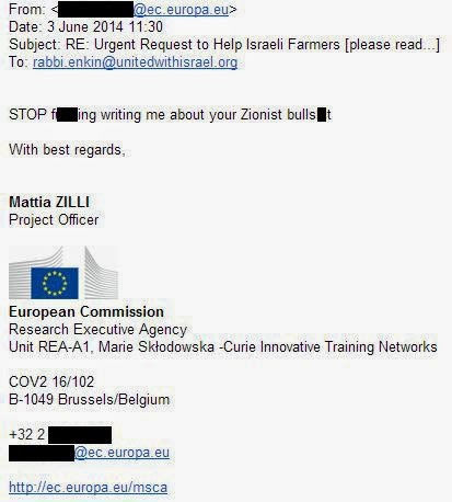 Blog : PhilosémitismeUn haut fonctionnaire européen se lâche vulgairement contre une ONG israélienne et maudit le sionisme?We at United with Israel are deeply saddened by Mr. Zilli's repeated hateful and anti-Zionist comments,? David Zeit, UWI's executive director, said. ?We hope that his hatred toward Israel is not representative of the European Commission's view of the Jewish State.? Le haut fonctionnaire s'était abonné à la lettre d'information en 2011 et au lieu de se désabonner selon une procédure très simple, il a préféré insulter le rabbin Ari Enkin de l'ONG United with Israel. Contacté par le JPost et United with Israel, Mattia Zilli n'a pas daigné répondre. C'est ça du courage et de la virilité. On se demande s'il aurait osé lancer une diatribe pareille contre une ONG arabe. Voilà l'ambiance qui règne chez les élites éduquées à Bruxelles, où il y a deux semaines on tué quatre personnes dans le Musée juif. JPost: Mattia Zilli, an official with the EC's Research Executive Agency asks to be taken off newsletter of Zionist NGO using less than diplomatic language. Israel and the EU may be appear to be cozying up with Monday's announcement of Israel's participation in the European Commission's Horizon 2020 research and innovation project, but apparently not everybody in the commission thinks too kindly of Israel. A European Commission official based in Brussels sent an expletive-filled anti-Zionist email this week in response to receiving a newsletter that he's subscribed to issued by a pro-Israel volunteer organization. ?STOP f***ing writing me about your Zionist bullshit,? wrote Mattia Zilli, a project officer with the EC's Research Executive Agency, in an email to the director of Jerusalem-based United with Israel after receiving an online newsletter he's been subscribed to since 2011. In response to an earlier UWI newsletter sent last week, Zilli wrote ?Spare me your Zionist bullshit.? According to a UWI spokesperson, Zilli could have unsubscribed in an easy and conventional manner at any time since signing up for it. Zilli did not respond to queries from UWI or The Jerusalem Post, but Koen Doens, head of the spokespersons' service at the European Commission, wrote that ?Our services will immediately look into this. Meanwhile, rest assured that the staff member of the European Commission will be told that the language used ? regardless of whether or not this is in response to real or perceived harassment ? is fully unacceptable. The matter will be followed up internally.? UWI's rabbinic director Rabbi Ari Enkin said he was ?shocked and saddened' by the vitriolic emails and that he would have appreciated a personal apology. 2 commentaires