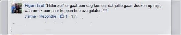 Blog : PhilosémitismeUne employée d'un hôpital belge cite Hitler et souhaite la mort des JuifsSource: The New Antisemite. Mme Figen Erol occupe les fonctions de "facilitatrice interculturelle" à l'hôpital Saint Francois à Heusden-Zolder (Belgique). Il est navrant que cette dame, qui occupe un poste important et qui doit jouir d'une solide formation, se permette de publier sur Facebook de propos antisémites d'une rare violence. Par exemple, ici Mme Figen Erol, qui visiblement connaît ses classiques, cite Hitler. Celui-ci aurait prédit qu'un jour on le maudirait du fait qu'il n'avait laissé en vie quelques Juifs. Le commentaire fut retiré. Sur le Facebook du magazine Knack, un certain Zafer Aksoy déclare: "Quand tous les Juifs seront morts ... alors il y aura un cessez-le-feu". Réponse de l'employée de l'hôpital Saint François: "C'est bien juste, et les autres peuvent aller se faire foutre (de pot op). Ou qu'ils aillent en Israël!! Si par chance Israël existe encore." Deux questions se posent. Est-ce que ces messages furent postés pendant les heures de service de l'employée' A-t-elle utilisé le matériel informatique de l'hôpital pour rédiger et publier ces commentaires' | Membre Juif.org