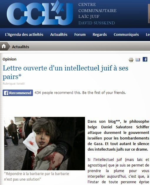 Blog : PhilosémitismeJCALL Belgique se déchaîne contre Alain Finkielkraut, Elie Wiesel, André Glucksmann, Obama"Pis : toujours prompt à les interrompre en plein milieu du débat, ce névrosé du discours, à défaut de pensée, n'y fait preuve, le plus souvent, que d'une attitude frisant, lors de ses très gestuelles diatribes, l'hystérie. Gare aux postillons!" (Daniel S. Schiffer à propos d'Alain Finkielkraut) Le CCLJ/JCALL, Belgique, a publié sur son site un texte de Daniel Salvatore Schiffer, qui se proclame à longueur d'articles "l'intellectuel juif (mais laïc et agnostique) que je suis" et "l'intellectuel juif mais laïc et agnostique qui me définit intrinsèquement" et "C'est un intellectuel juif épris des inaliénables valeurs de l'humanisme, prônant les principes universels de fraternité et de tolérance, qui vous le dit". Ce même article avait été publié par Marianne mais retiré sans doute en raison de son contenu outrancier. D'autre part, on se demande la raison qu'amène M. Schiffer à s'attaquer à certains intellectuels et pas à d'autres, alors même qu'il dénonce les "indignations sélectives" de certains intellectuels, il pratique donc lui-même l'"indignation" la plus sélective envers les personnes contre lesquelles il lance ses imprécations. Il s'en prend également au président Obama. L'article a été publié à divers endroits avec des titres différents: Conflit israélo-palestinien: les indignations sélectives des intellectuels juifs (Marianne, retiré), Lettre ouverte d'un intellectuel juif à ses pairs (Alain Finkielkraut, André Glucksmann, Bernard-Henri Lévy, Elie Wiesel) (son blog chez Media Part), Lettre ouverte d'un intellectuel juif à ses pairs* (CCLJ/JCALL), Israël-Palestine: face à ce conflit insupportable, je me sens couvert de honte. À ces pères et ces mères en larmes, toute ma compassion! (blog Nouvel Observateur). Il est consternant que des organisations juives publient ce genre de pamphlet. Il est tout aussi navrant de constater que 434 Belges ont recommandé cette diatribe et que la communauté juive ne réagisse pas. Notons, par ailleurs que la phrase: "ce funeste paragraphe issu de la première charte de l'OLP (Organisation de la Libération de la Palestine), jadis créée, en 1964, par feu Yasser Arafat: article selon lequel «tout Juif devait être rejeté à la mer»!" a disparu de la version du CCLJ/JCALL. Par ailleurs, sur son blog, Daniel Salvatore Schiffer s'en prend à nouveau à Alain Finkielkraut, avec le même style plouc et enragé: Alain Finkielkraut, Gaza et Le Figaro : un discours grotesque, inique et nauséabond. On verra si le CCLJ/JCALL va le dénoncer ou le publier... Modeste Schiffer affirme que c'est "sa tribune", tant apprécié par les Belges de JCALL, qui a poussé Le Figaro à interviewer A. Finkielkraut (sans oublier de rappeler "d'intellectuels juifs (dont je suis)": "Il est des interviews, au sein du paysage médiatique français, qui laissent pantois par leur évident manque de déontologie professionnelle, carence dont on ne sait si elle est due à une encore plus flagrante malhonnêteté intellectuelle ou à un étrange, pour ne pas dire pathologique, déni de la réalité. C'est le cas aujourd'hui, malheureusement pour ce journal, dans "Le Figaro", lequel vient de réaliser un "grand entretien" avec Alain Finkielkraut, en lui posant un certain nombre de questions, dans le seul but de le dédouaner de tout reproche, manifestement inspirées par la tribune que j'ai publiée tout récemment sur Le Plus." Schiffer se déchaîne contre les hypocrites du Figaro: "Ainsi, en ne m'y citant jamais nommément (ce qui n'est pas bien grave en soi) et feignant donc d'ignorer les vérités que j'assène là, ces hypocrites ont en fait décidé de nier, aveugles et sourds, le calvaire des palestiniens à Gaza: chose bien plus condamnable tant sur le plan moral qu'humain! Ce genre de méthode, typique de la mauvaise foi la plus patente, a un nom, aussi choquant soit-il à entendre ? le négationnisme ? Israël niant le droit à l'existence des Palestiniens en tant que peuple libre, détenteur d'un État indépendant et souverain." Extraits: "Israël, État qui vit le jour au lendemain de ce crime unique dans les annales de l'(in)humanité que fut la Shoah, n'a-t-il donc rien appris, ou si peu, des immortelles leçons de son douloureux passé? Répondre à la barbarie par la barbarie n'est guère une solution ; cet engrenage ne fait qu'attiser la haine et exacerber ce conflit. Un homme aux indignations sélectives Ainsi donc, Alain Finkielkraut, je vous le redis, à vous qui êtes toujours prompt à fustiger les crimes partout dans le monde à la notoire et irrationnelle exception de ceux perpétrés par Israël, avec une même conviction : - faites donc preuve ici d'honnêteté intellectuelle, de courage moral, de noblesse d'âme et de lucidité; - élevez-vous au-dessus des partis, prenez de la hauteur et condamnez le crime, même lorsqu'il provient de votre famille; Vous en sortirez grandis, et le monde vous en saura gré. Car votre mutisme, plus encore que vos indignations sélectives et à géométrie variable, vous déshonore. C'est un intellectuel juif épris des inaliénables valeurs de l'humanisme, prônant les principes universels de fraternité et de tolérance, qui vous le dit : votre position, dogmatique et manichéenne, s'avère effectivement une "défaite de la pensée" pour reprendre, ici encore, le titre de l'un de vos propres livres." Visiblement Schiffer n'a pas digéré le fait qu'Alain Finkielkraut, penseur à courte vue et "névrosé du discours", ait été élu à la "sacro-sainte" Académie française (et pas lui'??): Finkielkraut élu à l'Académie française : une tragédie pour la culture. C'est donc ce grand penseur que le CCLJ/JCALL a décidé d'honorer en le publiant. | Membre Juif.org