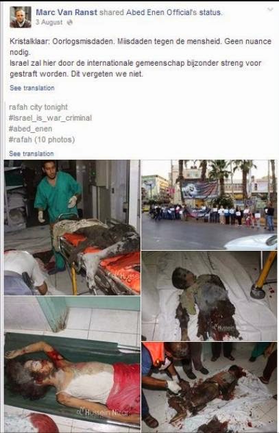 Blog : PhilosémitismeL'obsession anti-Israël du médecin flamand Marc van RanstLe professeur Marc van Ranst est un virologue à l'UZ Leuven. Il est obsédé par Israël qu'il essaye de délégitimer par tous les moyens et selon des méthodes bien rodées, notamment en inventant un nouveau vocable "gazacaust" (un terme révisionniste), en montrant des photos d'enfants palestiniens morts et mutilés lors de l'opération militaire d'Israël à Gaza, et toute la panoplie du parfait Israël-basher. Il est l'initiateur d'une pétition signée par une toute petite minorité de médecins belges condamnant Israël. Comme tout Israël-basher qui se respecte il évoque tel ou tel Juif qui a critiqué Israël - son Juif de choix est un certain Albert Einstein. Si même les Juifs le disent, van Ranst ne peut évidemment pas avoir tort. Et son obsession ne peut forcément pas être considérée comme antisémite. On se rappellera que feu le roi Hassan II disait que le conflit israélo-palestinien était l'aphrodisiaque des masses arabes... L'aphrodisiaque est certainement puissant. Le feu fut mis aux poudres lorsque Guido Joris, qui est soit dit en passant est chrétien, de Joods Actueel lui a demandé si ses grands-parents avaient de près ou de loin, comme tant de citoyens belges courageux, aidé à sauver des Juifs pendant la Shoah. Cette question lui fut posée tout simplement parce que le médecin prétend qu'Israêl a perdu le crédit historique de bienveillance que les Européens, y compris les bourreaux de Juifs, avaient bien voulu leur accorder. L'échange de correspondance fut publié dans le quotidien De Morgen. L'intellectuel britannique Chas Newkey-Burden, qui n'est pas Juif, démonte très bien les fondements cette logique perverse: "que des non-Juifs disent aux Juifs, nous avons tué six millions d'êtres de votre peuple et par conséquent c'est vous les Juifs et pas nous qui avez des leçons à en tirer. C'est un argument d'une folie atroce et méchante. Ne l'acceptez jamais; rejetez-le totalement. Nous, et pas les Juifs, devrions le savoir mieux que quiconque". Mais qu'en est-il du fameux crédit dont les Juifs et Israël ont bénéficié de la part de l'Europe' Il suffit de voir la situation en Europe des Roms qui furent également exterminés en masse par les nazis et leurs complices. Qui s'en soucie' Qui en parle' Le professeur van Ranst' Ce sont encore les Juifs qui rendent hommage à cette minorité persécutée. A-t-on vu le professeur van Ranst défendre les Roms' Les Tutsi, lors du génocide au Rwanda, et les survivants qui vivent avec des séquelles' Les chrétiens persécutés en Irak' Et on pourrait continuer cette liste. Vous voulez la réponse' Aller voir la page de Marc van Ranst sur Facebook. Ces dernières 24 heures il a publié environ 15 articles de diabolisation d'Israël. On peut aussi se demander si l'éthique médicale justifie la publication de ce genre de photos: | Membre Juif.org