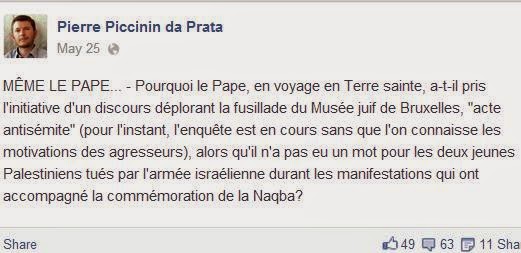 Blog : PhilosémitismePierre Piccinin, complotiste belge devenu éphémère blogueur sur Times of IsraelQuelle ne fut la surprise de constater que l'excellent site d'informations Times of Israel hébergait le blog de l'enseignant belge francophone Pierre Piccinin, obsédé par la mafia sioniste et le lobby juif international. Alerté par quelques personnes particulièrement vigilantes ToI l'a promptement supprimé. Pour le journaliste Max Loiseau: "Piccinin c'est aussi et avant tout un antisémite et un antisioniste notoire qui n'hésite pas à se servir de sa fonction à l'école européenne pour déverser sa haine à l'égard des Juifs!". Il est navrant que les nombreuses associations belges francophones qui prétendent défendre la communauté juive restent passives devant de telles outrances. Ca prend des allures tragico-comiques. ToI victime de cette passivité... Voici quelques propos de Pierre Piccinin: "Si 4 enfants juifs méritent une minute de silence, les enfants palestiniens méritent qu'on se taise à jamais... faites passer ce message qu'il arrive aux juifs." (écrit sur son Facebook à l'occasion de la tuerie de Toulouse) "Attaqué, une fois de plus, lâchement, par la mafia sioniste, je n'ai pas peur. Et un jour la peur changera de camp et ce sont eux qui en auront à rendre des comptes." L'article que M. Piccinin a publié ne mentionnait pas une seule fois le mot terrorisme et n'avait pas un mot de compassion pour les victimes israéliennes de la barbarie du Hamas. @ Times of Israel - lien supprimé.Repris de la page Facebook de Pierre Piccinin: "MÊME LE PAPE... - Pourquoi le Pape, en voyage en Terre sainte, a-t-il pris l'initiative d'un discours déplorant la fusillade du Musée juif de Bruxelles, "acte antisémite" (pour l'instant, l'enquête est en cours sans que l'on connaisse les motivations des agresseurs), alors qu'il n'a pas eu un mot pour les deux jeunes Palestiniens tués par l'armée israélienne durant les manifestations qui ont accompagné la commémoration de la Naqba'" "De Aziz Madrane, sur mon dernier post: "J'ai cru une seconde au boycott... J'suis sot quand je veux..." Excellent !" "Gaza, 168 morts déjà; le Monde entier silencieux... Et les gros titres sur la victoire de je ne sais qui pour le "Mundial". Je ne sais pas pourquoi j'écris ça, moi; des Palestiniens, c'est con... Ils ont l'habitude de mourir. "C'est culturel"..." - Pierre Piccinin, professeur d'histoire ou propagandiste anti-israélien entre autres' - Jamie Shea de l'OTAN ne débattra pas avec le pourfendeur de la "mafia sioniste", Pierre Piccinin - Pierre Piccinin, l'amertume d'un Tintin complotiste et idiot inutile - Presse belge: WikiLeaks, le crime qui profiterait à ... Israël - Pierre Piccinin: la haute trahison de "l'avionneur Serge Dassault (de son vrai nom Serge Bloch)" - Prof de l'Ecole européenne dénonce le pouvoir des Juifs aux États-Unis - La liberté d'expression menacée de mort en Belgique selon Pierre Piccinin (par, vous aurez deviné, qui) - Les démocrates tunisiens dénoncent l'entité sioniste ... au Belge Pierre Piccinin | Membre Juif.org