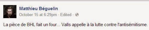 Blog : PhilosémitismeSuisse: le socialiste Matthieu Béguelin ose l'humour façon Le PenRappel: si Marine Le Pen a critiqué son père pour son "trait d'humour" sur Patrick Bruel. Ce n'est pas le cas du très respectable Parti socialiste suisse... Et puis en Europe on a toujours aimé rire sur le dos des Juifs! Source: Le Matin. L-ex-député neuchâtelois Matthieu Béguelin a fait une blague très forte teneur polémique. Et il assume! Sur la page Facebook de M.B. un internaute a écrit: "Si la pièce avait été de Brelaz, tu aurais dit qu'elle faisait un bide, j'imagine". Un autre: "Arrêtez de jouer les vierges effarouchées. Cette médiatisation est loin de vous déplaire cher ami. Et cette posture de poil à gratter vous ravis. Non'"Sur Facebook, il y a ceux qui parlent de foot, ceux qui postent des photos de ce qu'ils mangent et il y a Matthieu Béguelin. Ancien président des socialistes en Ville de Neuchâtel, ancien député, cet homme de théâtre n'est pas de ceux que la polémique effraie sur Ie réseau social. Mercredi, ce personnage haut en couleur a commenté à sa manière les déboires de Bernard-Henri Lévy, rapportés par Les Inrocks. Selon le magazine culturel, sa pièce «Hôtel Europe», censée être programmée à Paris jusqu'en janvier, s'arrêtera le mois prochain faute de public. Une nouvelle sur laquelle beaucoup ironisent, sauf que le théâtre de I'Atelier dément désormais le flop de l'?uvre du philosophe au décolleté le plus célèbre de France. «La pièce de BHL fait un four...Valls appelle à la lutte contre l'antisémitisme», écrit le socialiste neuchâtelois sur Facebook. A ceux pour qui le jeu de mots paraîtrait obscur, on rappelle que Bernard-Henri Lévy est juif, et que le «four» peut aussi bien évoquer l'insuccès du spectacle que des crématoires de sinistre mémoire... [...] Un commentaire lamentable pour la CICAD «Prétextant que l'expression fait partie du jargon théâtral, il ne manque pas d'accoler à son commentaire "Valls appelle à la lutte contre l'antisémitisme". Il n'y a malheureusement aucune ambiguïté dans son message. Une chance qu'il ait démissionné de ses mandats politiques. Après les propos de l'ex leader français du Front national, Jean-Marie Le Pen déclarant: «On fera une fournée la prochaine fois», en parlant de Patrick Bruel, notre ex-député neuchâtelois adepte de la "dissidence Dieudonniste" n'a pas démérité. Au regard de la réaction de la présidente du PS neuchâtelois, je ne peux qu'exprimer notre inquiétude. Loin de condamner les propos intolérables de Matthieu Beguelin, Silvia Locatelli les banalise, alimentant ainsi amalgames et stéréotypes. Cette affaire prend désormais une tournure politique plus importante pour laquelle il appartient désormais au Président du parti socialiste suisse de se prononcer et nous dire ce que lui inspire de tels dérapages. » explique Johanne Gurfinkiel, Secrétaire général de la CICAD Une indignation qui affecte assez peu Matthieu Béguelin: «De toute façon, je n'avais pas prévu de rire avec la CICAD.» Source: Le Matin, 17 octobre 2014 | Membre Juif.org