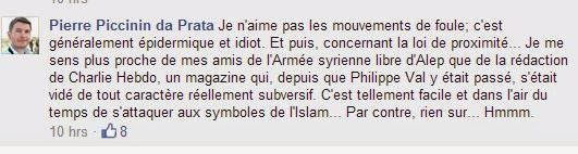 Blog : PhilosémitismeProf belge s'en prend aux "babines haineuses" des Français qui défendent Charlie, s'attaque aux Juifs, défend Dieudonné etc.."Attaqué, une fois de plus, lâchement, par la mafia sioniste, je n'ai pas peur. Et un jour la peur changera de camp et ce sont eux qui en auront à rendre des comptes." (Pierre Piccinin) Pierre Piccinin est un ancien professeur de l'Ecole européenne et enseigne actuellement en Wallonie à l'Athénée Royal Jean Rostand de Philippeville. Max Loiseau n'avait pas hésité à écrire que "Piccinin c'est aussi et avant tout un antisémite et un antisioniste notoire qui n'hésite pas à se servir de sa fonction à l'école européenne pour déverser sa haine à l'égard des Juifs!". Il se plaint de la mafia sioniste et a créé en grande fanfare une association pour protéger la liberté d'expression gravement menacée par la mafia juive (ASSOCIATION pour la PROTECTION des LIBERTÉS et du DROIT à l'EXPRESSION). Visiblement le Ministère de l'éducation et ses collègues ne s'offisquent pas de ses idées étalées sur Facebook. Comme l'apprécie également l'Israël-basher Sébastien Boussois (post-doctorant à l'Université Libre de Bruxelles) et qui a invité Piccinin à donner une conférence à l'Institut MEDEA(coopération euro-arabe) dont il est senior advisor. Boussois présente Piccinin comme étant un "historien et politologue". Rien que ça! Et quelle belle rigueur intellectuelle de la part des deux comparses. Pierre Piccinin a réagit sur Facebook sur le carnage perpétré par des terroristes musulmans dans les locaux de Charlie Hebdo (07/01/2015). Voici ce que ça donne et évidemment son illustre copain Sébastien Boussois n'a rien à redire: "Oui, vraiment, la France a la mémoire courte... Politiciens, journalistes et simples quidams hurlent tous en ch'ur, ce soir, sur toutes les chaînes de télévisions et de radios, contre une "atteinte à la liberté d'expression". Il y a quelques mois, les mêmes, en meutes, les babines haineuses, muselaient sans vergogne et avec une arrogance féroce la voix dissidente d'un certain humoriste d'origine camerounaise [Dieudonné]." Pierre Piccinin da Prata ... Comme pour le Musée juif, alors que tout le monde criait à l'acte antisémite, t'avais tout de suite compris que Daesh était derrière.January 7 at 11:22pm · 6 Pierre Piccinin da Prata Je n'aime pas les mouvements de foule; c'est généralement épidermique et idiot. Et puis, concernant la loi de proximité... Je me sens plus proche de mes amis de l'Armée syrienne libre d'Alep que de la rédaction de Charlie Hebdo, un magazine qui, depuis que Philippe Val y était passé, s'était vidé de tout caractère réellement subversif. C'est tellement facile et dans l'air du temps de s'attaquer aux symboles de l'Islam... Par contre, rien sur... Hmmm. [clairement le judaïsme inotuchable... l'obsession de Piccinin.]Yesterday at 12:28am · 9 Pierre Piccinin da Prata Je persiste, Florence: cette attaque n'a pas grand chose à voir avec la liberté d'expression; Charlie Hebdo a été ciblé, certes, à cause des caricatures du Prophète, mais l'objectif de l'attaque était de frapper la France, dans le contexte de la guerre contre l'EI, pas de porter atteinte à la liberté de la presse... ps: Dieudonné n'a jamais ciblé ses "victimes"; j'ai eu l'occasion de faire l'expérience "sociologique" d'assister à un de ses spectacles clandestin (c'était à Bruxelles), et les "victimes" auxquelles tu fais allusion n'était évoquée que très brièvement; son thème de prédilection était plutôt la "Françafrique"... L'image de cet humoriste véhiculée par une certaine presse dominante est plus que trompeuse; mais c'est c'est là un vaste débat et, tant le rouleau compresseur médiatique a bien écraser le bonhomme, un débat probablement perdu d'avance.Yesterday at 11:39am · 5Pierre Piccinin da Prata ps : Dieudonné est peut-être un peu gros, rondouillard dirais-je même, mais certainement pas inculte, Charles Gn, ni non plus raciste...Yesterday at 11:40am · 4 Pierre Piccinin da Prata Ben, c'est pas ça... Mais, comme j'ai pris l'habitude d'avoir raison avant tout le monde, d'en prendre plein la tronche quand je dis le contraire de tout le monde et puis, quand les faits me donnent raison, de me retrouver boycotté dans mon coin comme un con... j'ai décidé de me faire des compliments moi-même. C'est cool, non'January 7 at 11:27pm · 18 En anglais: Belgium: Teacher uses Charlie Hebdo shooting to hit at Jews | Membre Juif.org