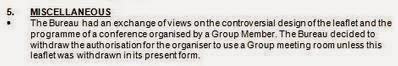 Blog : PhilosémitismeHypocrisie: le PS bloquait Charlie Hebdo au Parlement européen en 2006En 2008, le député européen socialiste portugais (un vrai défenseur de la liberté d'expression) Paulo Casaca a voulu organiser une conférence avec Charlie Hebdo au Parlement européen intitulée "L'Impact des caricatures sur la Paix et la Tolérance". Philippe Val, qui était rédacteur en chef, était l'un des orateurs. Le 17 mai 2006, le groupe PSE annonce avoir l'annulé la décision d'affecter une des salles de conférences du groupe socialiste pour l'événement en raison du dessin et du programme qualifiée en langue de bois de "controversés". On lit sous "Divers": "The Bureau had an exchange of views on the controversial design of the leaflet and the programme of a conference organised by a Group Member [Paulo Casaca]. The Bureau decided to withdraw the authorisation for the organiser to use a Group meeting room unless this leaflet was withdrawn in its present form."Ce sont précisément les mêmes qui, après le carnage, se font passer pour des défenseurs acharnés de la liberté d'expression et de Charlie Hebdo. Les multiples bals des hypocrites continuent. Il n'est pas étonnant que les citoyens européens ne fassent plus confiance à leurs dirigeants et à leurs élites médiatiques. Le dessin qui choque les socialistes bien-pensants. On notera dans le document ci-dessus que, par contre, la Palestine retient toute la bienveillance et l'attention du groupe socialiste grâce à deux pasionarias diligentes Pasqualina Napolitano et Véronique De Keyser. La proposition des ces dames fut l'objet "d'un long et intense débat" au sein du "Bureau" (en français dans le texte) dont le président était Harlem Désir. De surcroît, Harlem Désir proposa qu'une délégation ad hoc soit expédiée en Palestine et Israël dans le plus brefs délais. Proposition aceptée sur le champ. On notera également que la Palestine est nommée avant avant Israël et que c'est le brave contribuable européen qui financera le voyages de ces excellences... Merci les Socialistes. | Membre Juif.org