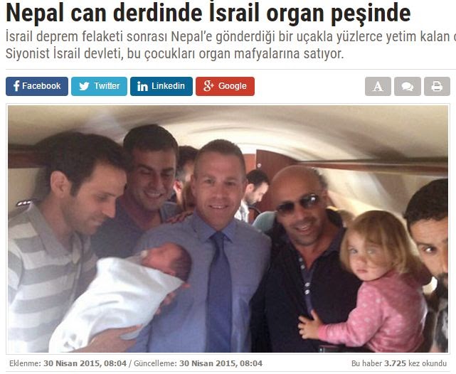 Blog : PhilosémitismeUn journal turc accuse Israël d'avoir pillé les organes de 24 orphelins népalaisOn savait que les accusations de trafic d'organes commises par les Israéliens au Népal n'allaient pas tarder. Cette fois-ci les Turcs ont été plus rapides que les Européens à dégainer l'accusation. Pour rappel, le journaliste suédois Donald Boström acusait en 2009: "le vol d'organes par l'armée israélienne dépasse les 1000", thèse défendue par un théologien suédois. Tout comme un journal grec. Source: The New Antisemite: Turkey: Islamist paper accuses Israel of kidnapping Nepalese kids for their organs Yeni Akit is an extreme Islamist newspaper with close ties to president Erdogan. Following the earthquake in Nepal, a recent article 'reported' that Israeli spies have been trying to kidnap Nepalese orphans to Israel and then selling them to organ-mafias. According to the paper, 24 children have already been taken this way. h/t Cem | Membre Juif.org