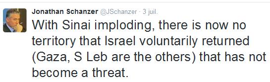 Blog : PhilosémitismeLa citation du jour - Jonathan Schanzer (35)Jonathan Schanzer "With Sinai imploding, there is now no territory that Israel voluntarily returned (Gaza, S Leb are the others) that has not become a threat." | Membre Juif.org