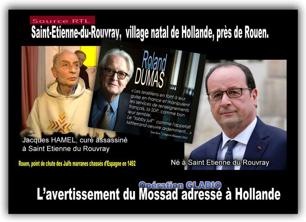Blog : Rencontre Judaïque FMSaint-Etienne du Rouvray, avertissement du Mossad !Le délire du mois- septembre 2016 Retour à une chronique qui repousse toujours plus loin les limites de l'absurde et du grotesque. A nouveau, c'est sur Facebook que j'ai trouvé cette perle, en faisant la veille de profils antisémites particulièrement virulents ! Les grands médias se sont faits l'écho des théories du complot "démontrant" la main du Mossad dans les attentats de "Charlie-Hebdo", du 13 novembre ou du 14 juillet à Nice. Pour le malheureux Père Jacques Hamel, égorgé dans son Eglise de Saint-Etienne du Rouvray par deux assassins de Daech parfaitement identifiés, il fallait vraiment avoir beaucoup d'imagination pour y trouver une "signature" - car pour les tristes salopards qui bâtissent de telles théories, le Juif, être malfaisant par nature, commet des forfaits mais en laisse la marque, comme pour les "Protocoles des Sages de Sion" où les comploteurs s'empressent d'écrire et de diffuser des protocoles secrets. Remarquons d'abord que, lorsqu'ils ne font pas état de l'objectif récurrent de créer une guerre civile en France - en montant contre les Musulmans le reste de la population par des attentats "sous faux drapeau" - les complotistes trouvent quand même le moyen de pointer du doigt Israël : il s'agit alors de "punir" la France, ou ses dirigeants, parce qu'ils ont fait ou vous faire quelque chose de déplaisant Ainsi, le malheureux François Hollande a-t-il été associé à la commune de Saint-Etienne du Rouvray, par ce montage photo totalement loufoque où il est écrit, sans preuve aucune : 1) Qu'il y est né ; 2) Qu'il descend de Juifs marranes. A propos de la vieille lune faisant de Hollande un Juif caché, voir cet article du blog qui a eu un succès incroyable (un total de plus de 13.000 visites à ce jour). J.C | Membre Juif.org