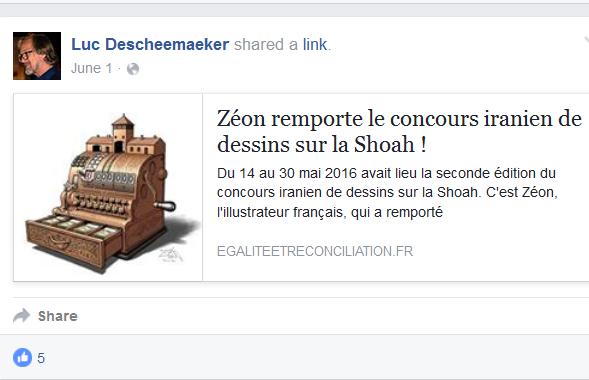 Blog : PhilosémitismeUn lauréat du concours antisémite sur la Shoah d'Iran nommé 'ambassadeur culturel' en BelgiqueCoolanews: Luc Descheemaeker, également connu en tant qu'O-Sekoer, a été nommé "ambassadeur culturel par excellence" de la ville de Torhout en Belgique. Nieuwsblad, le site d'informations belge, rapporte qu'il méritait bien ce titre en raison du fait que ses ?uvres ont été présentées dans le monde entier. En fait, il a remporté un concours de caricatures sur la Shoah en Iran.Luc Descheemaeker a été nommé par Hilde Crevits la maire de la ville de Torhout qui est également ministre flamande de l'Education. Elle est membre du parti CD&V (chrétien flamand). Récemment, la ministre État Zuhal Demir (N-VA) a créé la polémique en affirmant: "Je veux mettre en garde les Flamands: le CD&V est le nouveau parti des musulmans". Luc Descheemaeker est un admirateur du caricaturiste français Zéon, lui-même apprécié par Soral et Dieudonné, et lauréat du même concours. La caricature ci-dessous fut reprise par Luc Descheemaeker du blog de Soral Egalité et Réconciliation. Peut-on imaginer un lauréat du concours iranien qui se moque de la Shoah dans le rôle prestigieux d'ambassadeur culturel d'une importante ville française ou britannique ou allemande' Pour plus d'informations voir The New Antisemite: D'autres dessins par Zéon: Lire l'excellent article d'Elder of Ziyon ICI. | Membre Juif.org
