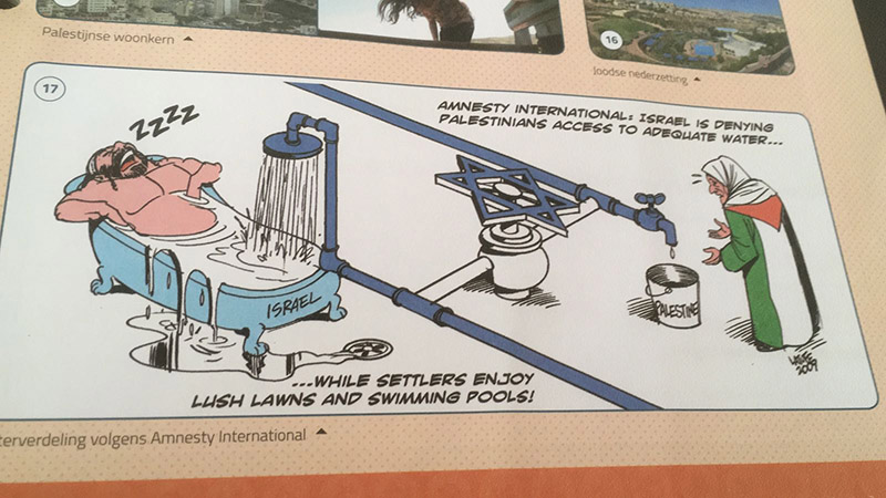 Blog : PhilosémitismeIncitation à la haine d'Israël dans un manuel scolaire belge (flamand)Cinq auteurs (Eric Goyvaerts, Arjan Goemans, Jesse Tuybens, Jens Luypaert et Kirsten De Cnijf) ont participé à rédaction du manuel scolaire publié en 2016 par l'éditeur Plantyn. Le manuel est estampillé GO!, projet pédagogique de la Communauté flamande. Pour expliquer aux élèves le conflit israélo-palestiniens, les auteurs ont recours à une caricature du dessinateur brésilien Carlos Latuff primé au concours antisémite des caricatures de l'Holocauste à Téhéran en 2006. Ce premier concours de dessins sur l'Holocauste a été salué par le ministre iranien de la Culture, Mohammad Hossein Saffar-Harandi. Il déclarait: "L'Holocauste est un mythe, et cette question a pris l'ampleur qu'elle connaît grâce à l'action du président Ahmadinejad qui a osé s'exprimer sur le sujet, et permis de briser le tabou. Avec cette action, ceux qui osent parler de l'Holocauste aujourd'hui dans le monde le font avec plus de facilité et ne se sentent plus coupables". (voir Libération). Latuff utilise dans son dessin une citation attribuée à l'ONG européenne Amnesty International, connue pour son biais anti-israélien. Traduction de la caricature: Amnesty International: "Israël refuse aux Palestiniens l'accès à l'eau en quantité suffisante ? pendant que dans les implantations, les Israéliens jouissent de pelouses luxuriantes et de piscines". En-dessous: "Partage de l'eau d'après Amnesty International" Source: Joods Actueel Un père, dont le fils de 15 ans est élève au lycée Jan Fevijn à Assebroek (Bruges), a contacté le magazine anversois Joods Actueel concernant les leçons de géographie dans la classe de son fils. Dans la section consacrée à Israël-Palestine du manuel du cours de géographie est reproduite une caricature attribuée à Amnesty International qui incite à la haine d'Israël et contient des informations inexactes. L'administratrice de l'Enseignement de la Communauté flamande, Raymonda Verdyck, a pris ses distances vis-à-vis de "cette caricature stéréotypée qui ne corresponde pas aux valeurs de notre projet pédagogique". Le père de l'élève s'est exprimé: "Je suis choqué par de telles caricatures antisémites inspirées directement de l'appareil de propagande de Joseph Goebbels". Inquiet, il a l'intention d'interpeller à ce sujet l'enseignant et la direction de l'école. La caricature se trouve dans le manuel Polaris GO!3 de l'éditeur malinois Plantyn et s'adresse à plusieurs milliers d'enfants fréquentant les établissements du réseau d'Enseignement de la Communauté flamande (Vlaamse Gemeenschapsonderwijs GO!) Le porte-parole d'Amnesty reconnaît que ce manuel est trompeur parce qu'il ne s'agit pas d'une caricature émanant d'Amnesty. D'ailleurs, le nom du caricaturiste, Latuff, est visible en bas à droite de l'image. Une simple recherche sur Google suffit à s'assurer que ce caricaturiste d'extrême gauche n'est aucunement au service d'Amnesty et que bien souvent, il propage des dessins controversés. Les auteurs ont donc consciemment utilisé cette caricature, sachant que sa source n'était pas Amnesty International et ont spécialement cité cette source pour induire en erreur. Israël et l'Autorité palestinienne ont conclu différents accords en matière d'approvisionnement et gestion de l'eau. Israël gère la rareté de l'eau de manière exemplaire et utilise des technologies innovantes telles le dessalement d'eau de mer. Si les Palestiniens n'agissent pas de la même manière et n'ont aucun respect, c'est leur propre responsabilité qui est engagée et pas celle d'Israël. Par exemple, les Palestiniens ne s'occupent guère de purification et recyclage de l'eau malgré le fait que des pays donateurs ont prévu des fonds à cet effet. Un autre problème est le fait que des Palestiniens ponctionnent illégalement de l'eau dans différentes points de la Cisjordanie, avec comme conséquence que leur frères dans d'autres villes palestiniennes en sont privés. La responsable de l'Enseignement de la Communauté flamande de Belgique, Raymonda Verdyck, souligne que son organisation GO! ne réalise pas de manuels scolaires et précise que certains éditeurs "pour des raisons publicitaires, mentionnent le logo "GO!" sur la couverture" et ajoute "nous n'avons rien à voir avec leur réalisation". "Sans vouloir nous prononcer sur la question de fond, nous voulons prendre nos distances vis-à-vis de cette caricature stéréotypée dans un manuel qui fait référence aux programmes scolaires du GO!. "Nous pensons qu'il est important, et c'est prévu dans le programme scolaire, que dans les cours de géographie on fasse un travail de prise de conscience, alors que souvent les médias, à partir d'une perspective partisane, donnent une vision biaisée des conflits géopolitiques. La manière dont ce sujet est traité dans ce manuel ne correspond pas aux valeurs de notre projet pédagogique". Michel Freilich, rédacteur en chef de Joods Actueel précise: "Nous attendons que le ministère de l'Education prenne rapidement des mesures appropriées car l'incitation à la haine sur base de fausses informations est exactement le contraire de ce à quoi sert l'enseignement. Nous attendons aussi une réaction de la part de l'éditeur". L'auteur et homme politique André Gantman (N-VA) a également réagit: "Cette caricature trouverait parfaitement sa place dans le Völkischer Beobachter des Nazis. C'est de l'antisémitisme de la plus pure espèce: ne pas agir immédiatement et fermement constituerait une négligence coupable de la part de la ministre de l'Education et de l'administration". | Membre Juif.org