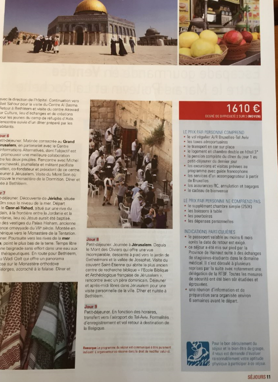 Blog : PhilosémitismeTel Aviv se trouverait "en terre de Palestine" (Mutualité Socialiste belge francophone)La Mutualité Socialiste du Brabant (Belgique francophone) propose à ses membres du troisième âge un voyage "bousculant" en "terre de Palestine". La brochure ne mentionne pas Israël alors que les voyageurs passent deux nuits à Tel Aviv. Il y est également indiqué "vol régulier A/R Bruxelles-Tel Aviv". Il s'agit du cinquième voyage "en terre de Palestine" organisé par la Mutualité. Au programme est prévue une rencontre avec Michel Warschawski. En 2012, Richard Prasquier, à l'époque président du Crif, écrivait: "Voici une nouvelle particulièrement consternante et même scandaleuse. Michel Warschawski, figure de l'extrême gauche israélienne et inlassable pourfendeur d'Israël, se verra remettre, le 10 décembre 2012, à Paris, le prix des Droits de l'Homme de la République Française (2012), par le Premier ministre, Jean-Marc Ayrault. Ce prix, créé en 1988, est destiné à récompenser des actions individuelles ou de terrain, sans considération de nationalité ou de frontières, menées en France ou à l'étranger. Michel Warschawski préside le Centre d'Information Alternative (AIC) de Jérusalem, constitué en 1984 et dont le projet est éminemment politique." Cela nous donne une bonne idée de l'esprit dans lequel ce voyage a été conçu. Aucun des autres voyages proposés ne contient un volet politique et de critique du pays de destination: Escapade gourmande en Vendée; Thermalisme en Italie - Remise en forme en Vénétie; Remise en forme en Grèce - Thermalisme dans le Golfe de Corinthe; Randonnée en Drôme; Evasion à Prague - Un musée à ciel ouvert; Circuit en Algarve - Découverte du sud du Portugal - Voici un magnifique circuit à la découverte de l'Algarve, région du sud du Portugal baignée de soleil... Une fois de plus le fameux deux poids deux mesures est à l'oeuvre. Fiche d'inscription pour le "Circuit en Palestine". On notera que la mention "Israël" est soigneusement omise. 2 commentaires