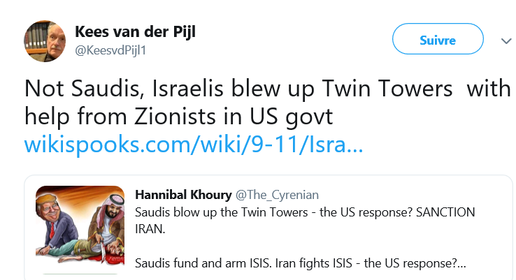 Blog : PhilosémitismePays-Bas: un professeur affirme que les sionistes sont responsables des attentats du 11 septembreKees van der Pijl, un ancien professeur qui dirigeait le Département de relations internationales de l'Université de Sussex, a partagé dans un tweet un article du site conspirationniste WikiSpooks, prétendant que ce sont les Israéliens avec l'aide de sionistes américains qui ont fait sauter les tours jumelles, et pas Al Qaïda. Suite à quelques timides protestations, Kees van der Pijl, qui est Hollandais et a fait ses études à l'Université d'Amsterdam, a écrit: "Après ma remarque sur la responsabilité sioniste dans les attentats du 11 septembre, le 'lobby israélien' n'est plus, pour moi, un terme vide de sens. Cependant, nous devons mettre fin à la meurtrière 'guerre contre le terrorisme' ((c) Netanyahu 1986), qui a maintenant pour objectif l'Iran".Il convient de rappeler qu'il y a 15 ans (2003), un sondage avait révélé qu'une majorité d'Européens estime qu'Israël constitue la plus grave menace pour la paix dans le monde. Si la moyenne est de 59% chez les Européen, les Hollandais battent tous les records avec 74%. Or comme souligné ci-dessus le Professeur van der Pijl est Hollandais. "On constate par exemple que les taux de défiance à l'égard d'Israël concernent 74% des sondés aux Pays-Bas et 69% en Autriche, alors que des pays présentés de longue date, par Washington notamment, comme des repaires du terrorisme international (la Syrie, la Libye, la Somalie) n'enregistrent que des score marginaux (respectivement 37%, 36% et 16%)."Surtout n'hésitez pas à consulter le compte Twitter de Kees' vous serez éclairé. 1 commentaire