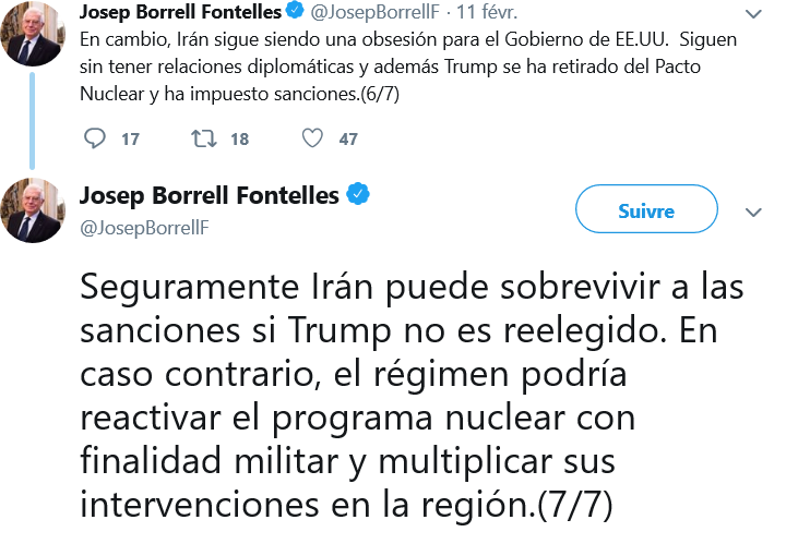 Blog : PhilosémitismeLe successeur de Federica Mogherini: une mauvaise nouvelle pour IsraëlThe Times of Israel: Les responsables israéliens suivent avec méfiance la passation de fonctions à l'Union européenne, où quelqu'un qui a récemment lancé l'idée d'une reconnaissance unilatérale de l'État palestinien et qui a exprimé son ferme soutien à l'Iran a été désigné comme prochain responsable de sa politique étrangère. Le Conseil européen a désigné mardi le ministre espagnol des Affaires étrangères, Josep Borrell Fontelles, membre du Parti socialiste ouvrier espagnol [PSOE] au pouvoir dans le pays, comme premier diplomate de l'UE. [?] En revanche, Borrell, un homme d'État expérimenté qui fait de la politique depuis 1993, est considéré comme très critique envers Israël. «Des temps plus difficiles [sont] à venir entre l'UE et Israël, je le crains», a tweeté Bas Belder, un membre néerlandais du Parlement européen et grand défenseur pro-Israël. «Ce ne sera pas du gâteau avec lui», a déclaré un diplomate israélien, s'exprimant sous couvert d'anonymat car il n'était pas autorisé à en discuter avec la presse. Lorsque Borrell a été nommé ministre des Affaires étrangères de l'Espagne l'année dernière, il est rapidement devenu un ardent défenseur de la reconnaissance d'un État palestinien. «Il est évident que la situation en Palestine ne doit pas continuer telle qu'elle est», a déclaré M. Borrell en septembre 2018. «Si l'UE n'est pas en mesure de parvenir à une décision unanime, alors chacun à sa façon», a-t-il déclaré, indiquant que Madrid envisagerait de reconnaître unilatéralement l'État palestinien. [?] Dans un éditorial cinglant du 18 mai 2018, le ministre des Affaires étrangères a condamné Israël pour sa réponse aux émeutes à la frontière de Gaza quatre jours auparavant, qui coïncidait avec le 70e anniversaire de la création de l'État d'Israël et l'ouverture de l'ambassade des États-Unis à Jérusalem. Ces célébrations ont été «couvertes de sang car ce lundi noir reflète la déshumanisation des Palestiniens par une grande partie de la classe politique et de la société israéliennes», a-t-il écrit dans Republica. [?] Dans l'article de Republica, Borrell dénonce les campagnes militaires israéliennes contre le Hamas à Gaza comme de «terribles bombardements» et dénonce «l'arrogance guerrière» de Netanyahu. Critique virulent du président américain Donald Trump, le nouveau chef de la politique étrangère de l'UE est également critiqué pour ses positions pro-iraniennes. En février, par exemple, il a envoyé sur Twitter un message de félicitations et sans aucune critique à l'occasion du 40e anniversaire de la Révolution islamique. [?] Mais, comme beaucoup de politiciens européens qui avaient autrefois de la sympathie pour Israël, «quelque part en cours de route, il est devenu très critique», a dit l'officiel israélien. Lire l'article complet Karim Sadjadpour: The long-standing divide between the US and Europe on Iran is summarized in this sentence from the European Union's new foreign policy chief, Josep Borrell: ?Iran wants to wipe out Israel; nothing new about that. You have to live with it." ? 1 commentaire