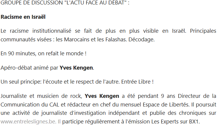 Blog : PhilosémitismeDes Juifs belges accusent Israël de "racisme institutionnalisé ... de plus en plus visible"Le Centre Communautaire Laïc Juif David Susskind (CCLJ) de Bruxelles organise un apéro (sic), facétieusement intitulé CAFÉ DU COMMERCE, LUFTGESCHEFT ET PLOTKES (sic), avec Yves (sic) pour "refaire le monde" et accuser Israël de pratiquer un "racisme institutionnalisé" dont les principales communautés visées sont "les Marocains" (sic) et les Falashas. Laissant entendre que d'autres communautés font également l'objet de "racisme" en Israël. Et c'est gratuit, gratis. Il ne faut même pas payer. Le CCLJ a récemment élu un nouveau dirigeant en la personne de l'ancien politique du PS, M. Isi Halberthal' Il semble que ces accusations n'aient pas suscité une quelconque réprobation de la part de la communauté juive belge francophone. Un Apéro avec Yves: CAFÉ DU COMMERCE, LUFTGESCHEFT ET PLOTKES Lundi 25 Novembre 2019 à 18:00Racisme en Israël GROUPE DE DISCUSSION "L'ACTU FACE AU DÉBAT": Racisme en Israël Le racisme institutionnalisé se fait de plus en plus visible en Israël. Principales communautés visées : les Marocains et les Falashas. Décodage. En 90 minutes, on refait le monde! Apéro-débat animé par Yves Kengen. Un seul principe: l'écoute et le respect de l'autre. Entrée Libre! Journaliste et musicien de rock, Yves Kengen a été pendant 9 ans Directeur de la Communication du CAL et rédacteur en chef du mensuel Espace de Libertés. Il poursuit une activité de journaliste d'investigation indépendant et publie des chroniques sur www.entreleslignes.be. Il participe régulièrement à l'émission Les Experts sur BX1. On notera que le CCLJ organise également un débat sur Imre Kertész (1929-2016), écrivain hongrois, survivant des camps de concentration et lauréat du prix Nobel de littérature en 2002. Or Imre Kertész avait averti: "Je crois que les juifs d'Europe commettent une erreur suicidaire quand, sous prétexte de critiquer Israël, ils s'étouffent d'indignation avec les intellectuels et hauts fonctionnaires européens qui drapent le vieil antisémitisme dans un nouveau langage, et qui hier encore voulaient les exterminer; pourquoi donc auraient-ils changé leurs intentions' [?] J'en arrive à conclure que le juif d'Europe est effectivement un personnage nuisible qui déteste voir des armes de défense entre les mains de juifs et voir dans sa propre extermination l'unique solution à sa vie vécue avec une conscience abjecte et confuse. Il n'arrêtera pas tant qu'il n'aura pas atteint son but, tant qu'il n'aura pas été déporté dans un nouvel Auschwitz, battu, dépouillé, tant qu'il n'aura pas creusé sa propre tombe, etc.: tout cela l'étonnera à nouveau, comme autrefois." (10 août 2002) 2 commentaires