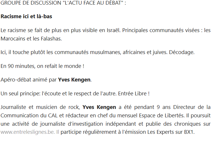 Blog : PhilosémitismeDes Juifs belges accusent Israël de "racisme institutionnalisé" (MàJ)Finalement, le Centre Communautaire Laïc Juif David Susskind (CCLJ) de Bruxelles a changé l'intitulé et la description de son apéro (sic)/débat sur le "racisme institutionnalisé" en Israël (voir la capture d'écran ci-dessous et notre post du 26/10 également reproduit ci-après). L'intitulé s'est métamorphosé en "Racisme ici et là-bas. Le racisme institutionnalisé se fait de plus en plus visible en Israël. Principales communautés visées: les Marocains et les Falashas". On constatera que le terme "institutionnalisé" a disparu, mais l'accusation demeure. Le CCLJ profite de l'occasion pour faire, sans la moindre gêne, la promotion du blog www.entreleslignes.be - qui est celui du socialiste francophone et Israël-basher Pierre Galand et de sa femme également Israël-basheuse Gabrielle Lefèvre? Pierre Galand préside depuis plus de 40 ans - un record mondial - l'Association Belgo-Palestinienne Wallonie-Bruxelles Israël et accuse Israël, entre autres crimes, de pratiquer l'apartheid et d'être un pays' raciste. Philosémitisme (26 octobre): Le Centre Communautaire Laïc Juif David Susskind (CCLJ) de Bruxelles organise un apéro (sic), facétieusement intitulé CAFÉ DU COMMERCE, LUFTGESCHEFT ET PLOTKES (sic), avec Yves (sic) pour "refaire le monde" et accuser Israël de pratiquer un "racisme institutionnalisé" dont les principales communautés visées sont "les Marocains" (sic) et les Falashas. Laissant entendre que d'autres communautés font également l'objet de "racisme" en Israël. Et c'est gratuit, gratis. Il ne faut même pas payer. Le CCLJ a récemment élu un nouveau dirigeant en la personne de l'ancien politique du PS, M. Isi Halberthal' Il semble que ces accusations n'aient pas suscité une quelconque réprobation de la part de la communauté juive belge francophone. Un Apéro avec Yves: CAFÉ DU COMMERCE, LUFTGESCHEFT ET PLOTKES Lundi 25 Novembre 2019 à 18:00Racisme en Israël GROUPE DE DISCUSSION "L'ACTU FACE AU DÉBAT": Racisme en Israël Le racisme institutionnalisé se fait de plus en plus visible en Israël. Principales communautés visées : les Marocains et les Falashas. Décodage. En 90 minutes, on refait le monde! Apéro-débat animé par Yves Kengen. Un seul principe: l'écoute et le respect de l'autre. Entrée Libre! Journaliste et musicien de rock, Yves Kengen a été pendant 9 ans Directeur de la Communication du CAL et rédacteur en chef du mensuel Espace de Libertés. Il poursuit une activité de journaliste d'investigation indépendant et publie des chroniques sur www.entreleslignes.be. Il participe régulièrement à l'émission Les Experts sur BX1. On notera que le CCLJ organise également un débat sur Imre Kertész (1929-2016), écrivain hongrois, survivant des camps de concentration et lauréat du prix Nobel de littérature en 2002. Or Imre Kertész avait averti: "Je crois que les juifs d'Europe commettent une erreur suicidaire quand, sous prétexte de critiquer Israël, ils s'étouffent d'indignation avec les intellectuels et hauts fonctionnaires européens qui drapent le vieil antisémitisme dans un nouveau langage, et qui hier encore voulaient les exterminer; pourquoi donc auraient-ils changé leurs intentions' [?] J'en arrive à conclure que le juif d'Europe est effectivement un personnage nuisible qui déteste voir des armes de défense entre les mains de juifs et voir dans sa propre extermination l'unique solution à sa vie vécue avec une conscience abjecte et confuse. Il n'arrêtera pas tant qu'il n'aura pas atteint son but, tant qu'il n'aura pas été déporté dans un nouvel Auschwitz, battu, dépouillé, tant qu'il n'aura pas creusé sa propre tombe, etc.: tout cela l'étonnera à nouveau, comme autrefois." (10 août 2002) 1 commentaire
