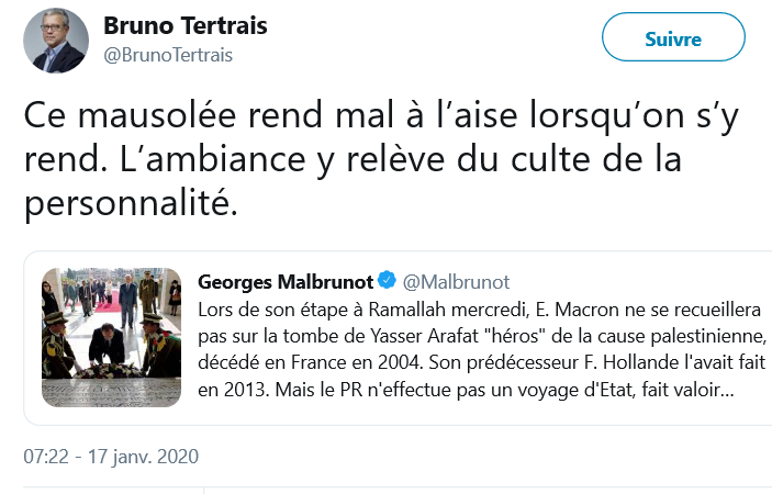Blog : PhilosémitismeEmmanuel Macron ne se recueillera pas sur la tombe d'Arafat lors de son étape à Ramallah mercrediLe président français Emmanuel Macron se rendra en Israël le 23 janvier prochain dans le cadre du cinquième Forum international sur la Shoah organisé en coopération avec Yad Vashem, et en présence de nombreux dirigeants internationaux. (Israel Valley) Georges Malbrunot: Lors de son étape à Ramallah mercredi, E. Macron ne se recueillera pas sur la tombe de Yasser Arafat "héros" de la cause palestinienne, décédé en France en 2004. Son prédécesseur F. Hollande l'avait fait en 2013. Mais le PR n'effectue pas un voyage d'Etat, fait valoir l'Elysée.Commentaire de Bruno Tertrais: Ce mausolée rend mal à l'aise lorsqu'on s'y rend. L'ambiance y relève du culte de la personnalité. 4 commentaires