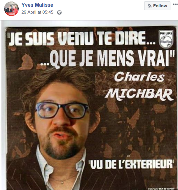 Blog : PhilosémitismeQue le PTB belge f. la paix aux Juifs français. Serge Gainsbourg n'est pas Charles Michbar!"«C'est de l'humour», selon l'auteur du photomontage, un certain Yves Malisse. «De l'humour' C'est aussi ce que dit Dieudonné», rétorque Joël Rubinfeld, le président de la LBCA." Un lecteur a signalé un autre photomontage également posté sur Facebook par Yves Malisse un militant du PTB (extrême gauche belge francophone) qui gère le groupe Facebook du PTB de Mouscron. Après s'être "inspiré" du film français Rabbi Jacob pour s'attaquer au Premier ministre belge Charles Michel. La réplique culte «Rabbi Jacob il va danser» a été remplacée par «Rabbi Michel il va taxer». C'est clair que pour ce génie de la pensée, un Juif fait la poche aux pauvres. Yves Malisse qui se présente comme un pauvre "invalide" de 60 ans a choisi un autre Juif français pour s'attaquer à M. Charles Michel. Il s'agit de Serge Gainsbourg mué en Charles Michbar. Les paroles de la chanson de Serge Gainsbourg sont détournées "Je suis venu te dire ? que je mens vrai", signées Charles Michbar, en référence à Gainsbarre. Pourquoi cette incroyable obsession pour les Juifs français' Pourquoi instrumentalise-t-il des Juifs français pour s'attaquer à un politicien belge le faisant passer pour Juif' Ne peut-il pas trouver d'autres "repères", d'autres "inspirations"? On connaît l'hostilité du PTB envers Israël. Que ses militants aient au moins la décence d'épargner les Juifs français. 4 commentaires